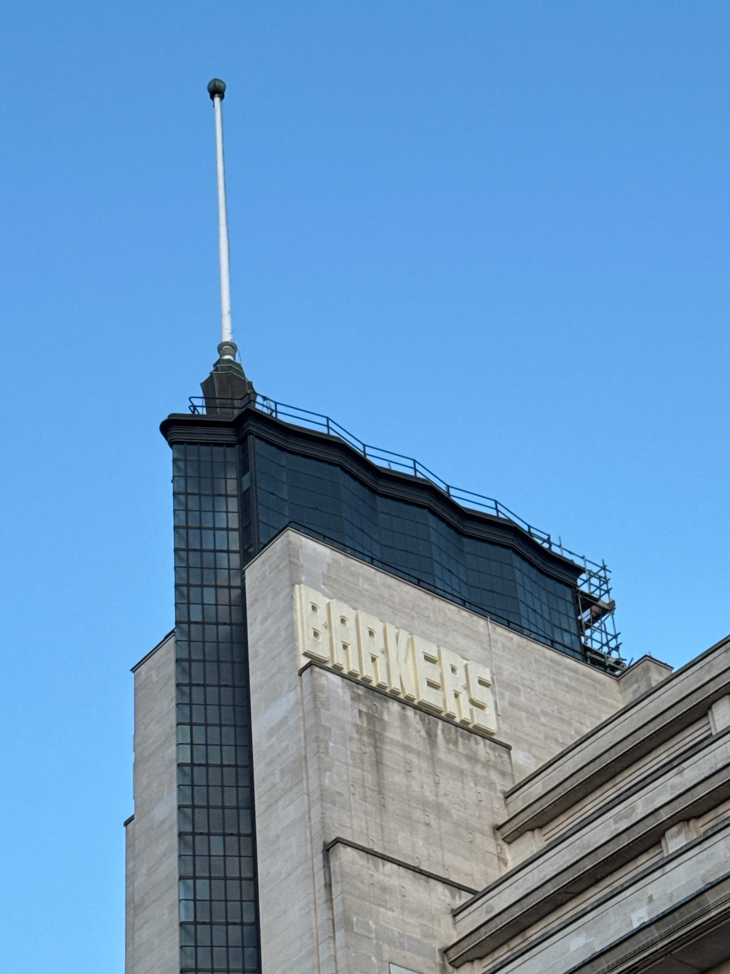 The image shows the top portion of a building against a clear blue sky. The building's architectural style appears to be Art Deco, with a prominent spire and decorative elements. A white rod, likely a…read more