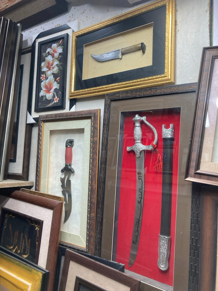 The image presents a detailed view of multiple framed decorative objects displayed in what appears to be an indoor commercial setting, likely a shop or gallery, located in Quetta City Tehsil, Pakistan…read more