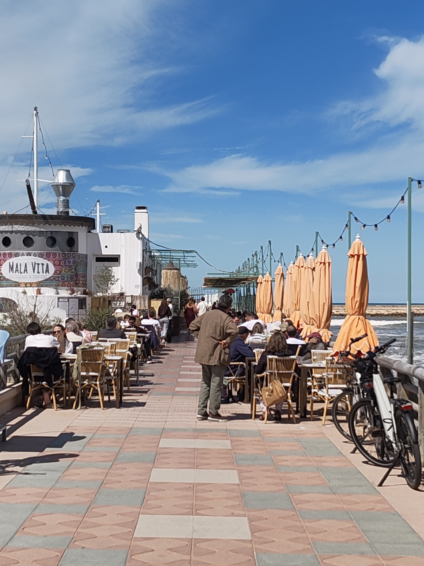 The photograph captures a vibrant outdoor scene in Dénia, Spain, featuring a restaurant called "Mala Vita" adjacent to a tiled pedestrian walkway. Patrons are seated at numerous tables with wicker cha…read more