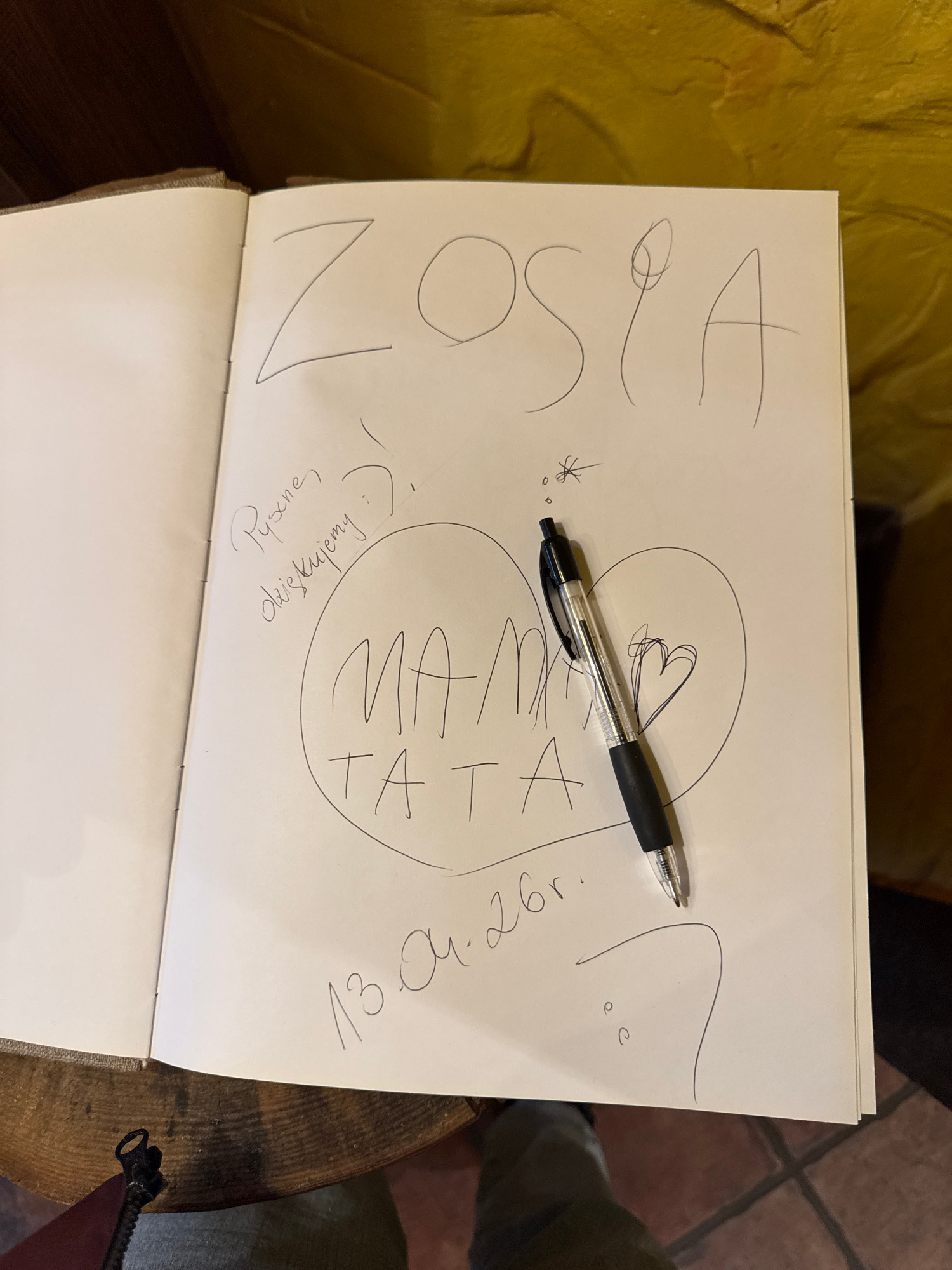 A close-up shot depicts an open notebook resting on a wooden surface, possibly a table. The notebook is open to a page covered in handwritten text and doodles. The text "ZOSIA" is written vertically o…read more