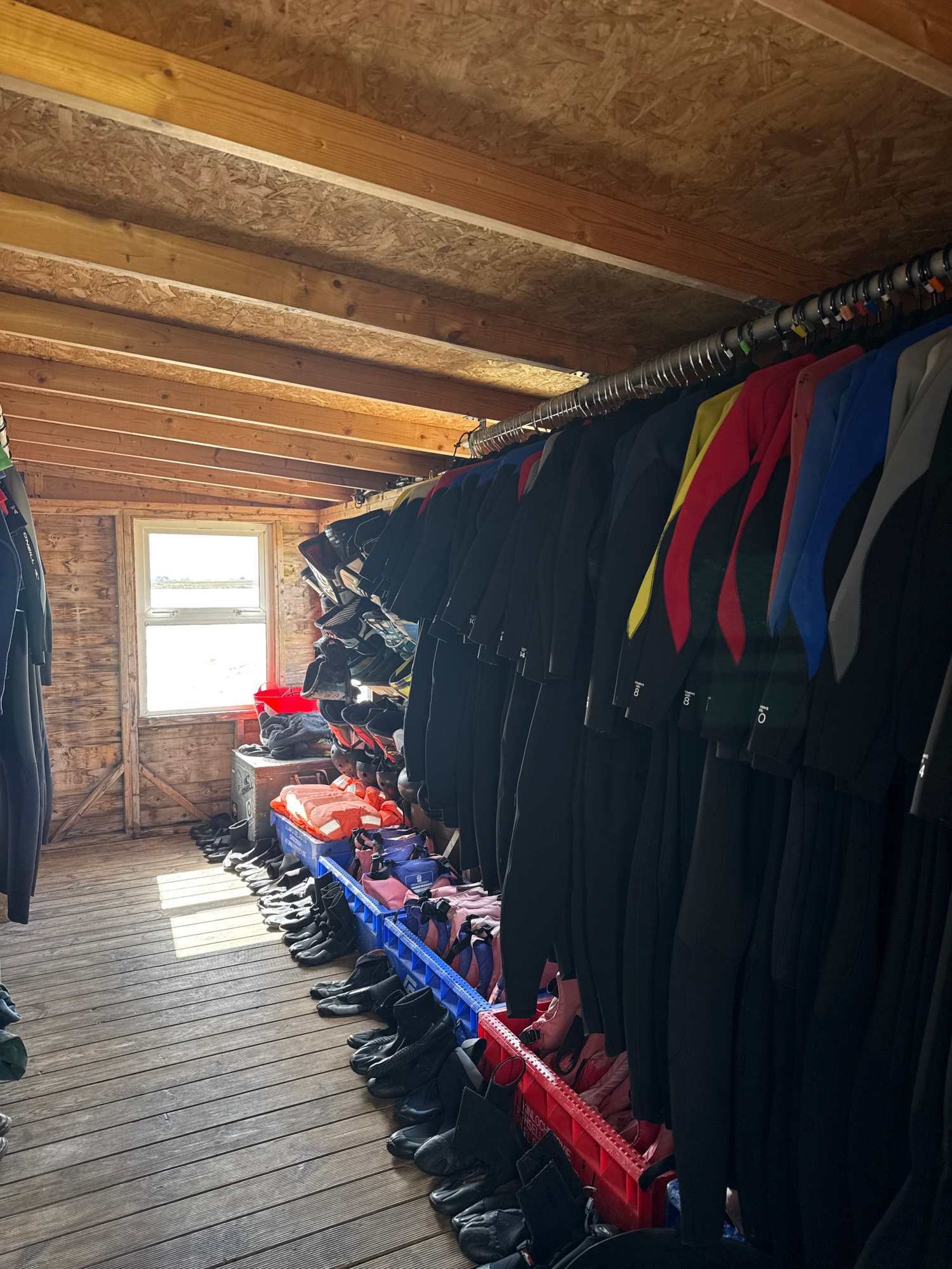The image shows the interior of a shed-like structure in an unknown location. The walls are made of wood paneling and exposed wooden beams. A window provides natural light. Wetsuits of varying colors…read more
