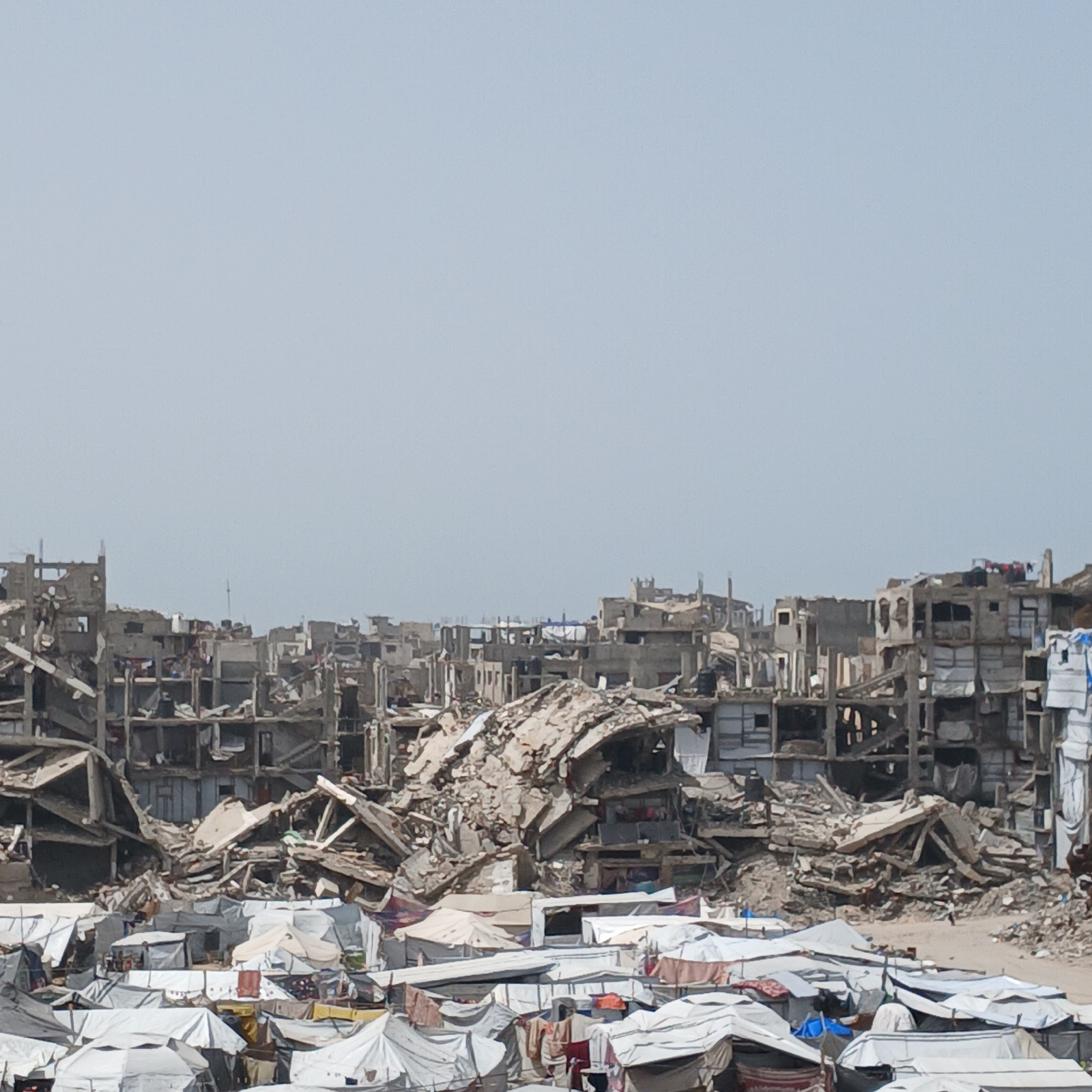 The image depicts a scene of devastation in what appears to be the city of Gaza, Palestinian Territory. The foreground and central area are dominated by the skeletal remains of buildings, reduced to r…read more