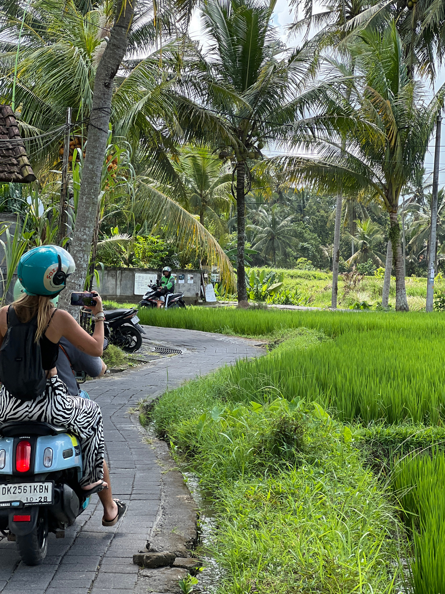 A woman on a blue scooter with a zebra-print seat, license plate "DK2561KBN 10.28," is holding her phone up as if taking a picture. She's wearing a turquoise helmet, black top, and zebra-print pants.…read more