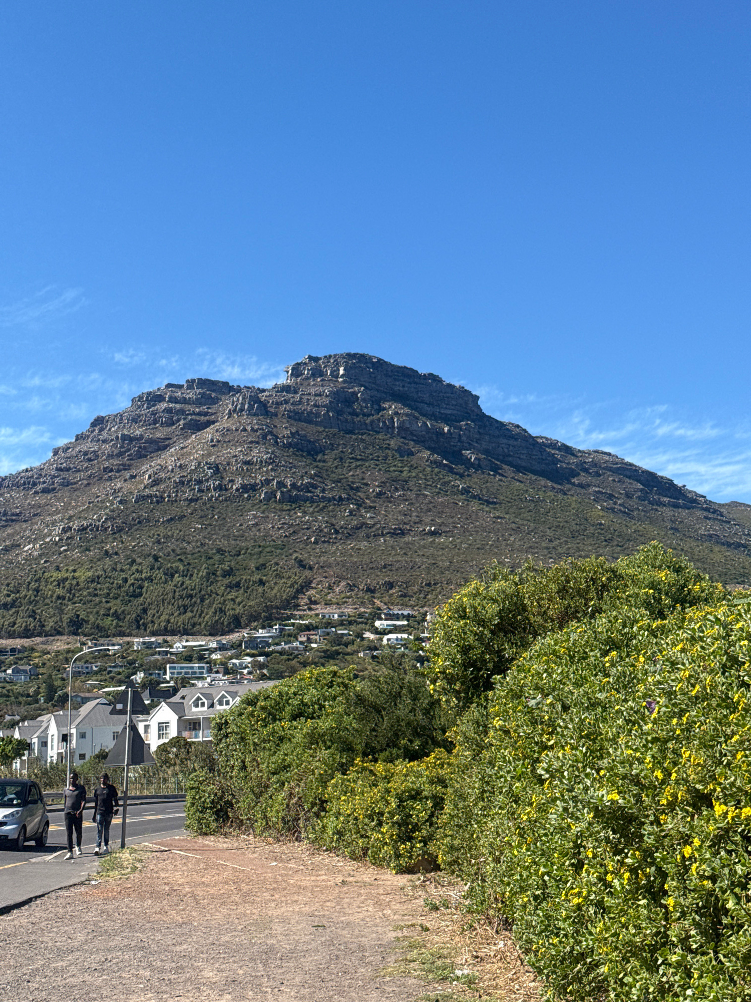 The image captures a view of Hout Bay, South Africa. A large, rocky mountain occupies the left half of the frame, with sparse vegetation clinging to its slopes. Below the mountain, a cluster of houses…read more
