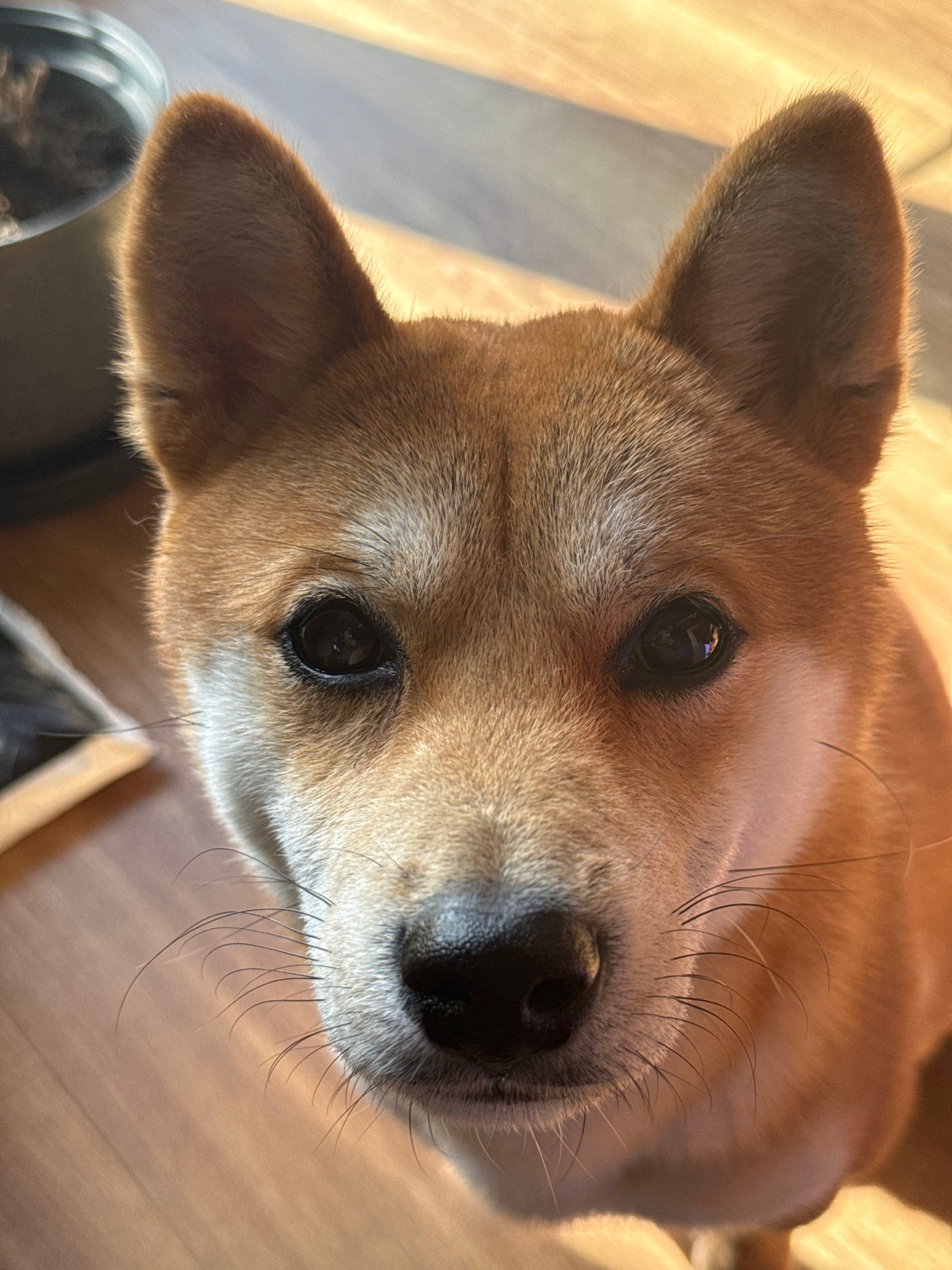 A close-up, high-angle photograph shows the head and face of a reddish-brown Shiba Inu dog. The dog's face fills most of the frame. Its black eyes are looking directly at the viewer. The dog's nose is…read more