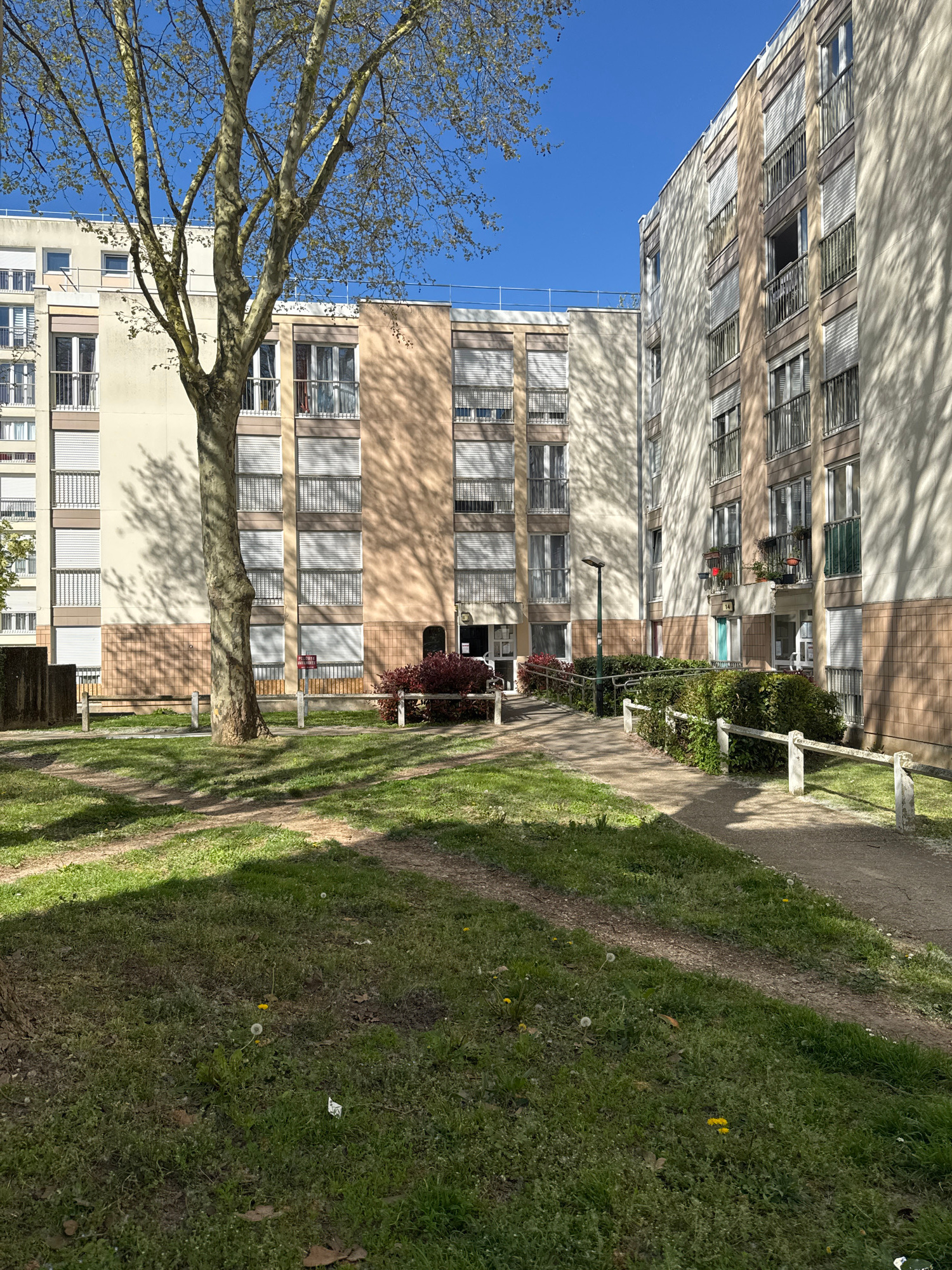 The image depicts a residential scene in Les Ulis, France. The scene is dominated by several multi-story apartment buildings with beige and brown facades. Many windows are covered with white blinds. A…read more