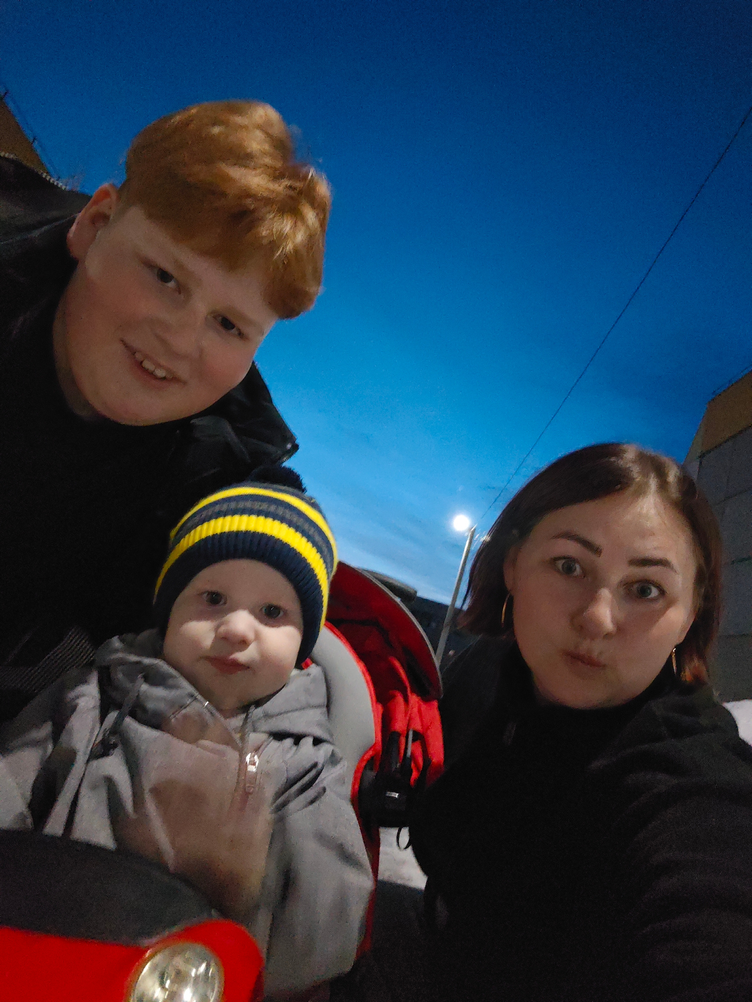 An upward-angled photograph captured in Марковский, Russia, depicts three individuals outdoors at dusk or night. In the upper left quadrant, a male with reddish-blonde hair and a dark jacket smiles directly at the camera. Centered below him is an infant or young child, wearing a grey hooded jacket and a navy and yellow striped beanie, seated in a red and grey child transport device, also looking directly forward. To the right, an adult female with dark brown hair and gold hoop earrings looks intently at the camera with widened eyes and pursed lips. The background features a deep blue sky. To the far right, a light-colored building is partially visible. A street lamp, illuminated, stands upright in the mid-ground behind the female, with a dark wire crossing the sky above her. Snow is faintly visible on the ground in the mid-ground. The lower left foreground shows the red front portion of the child's transport device, including a metallic element. | Open Wire