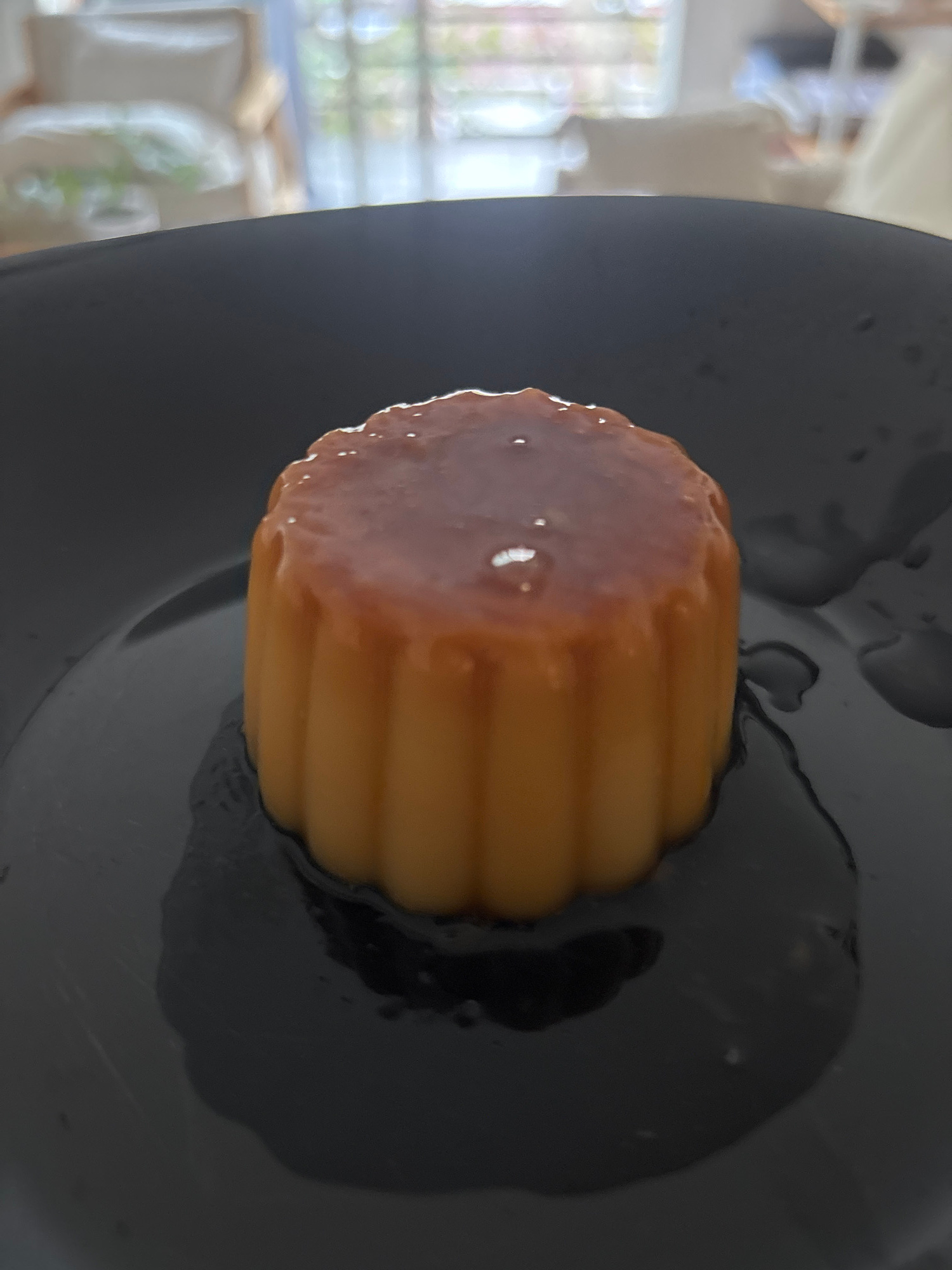 A creme caramel dessert sits on a gray plate. The dessert has a caramelized top and ridged sides. A clear syrup surrounds the dessert on the plate. A blurred background is visible through a window, wi…read more