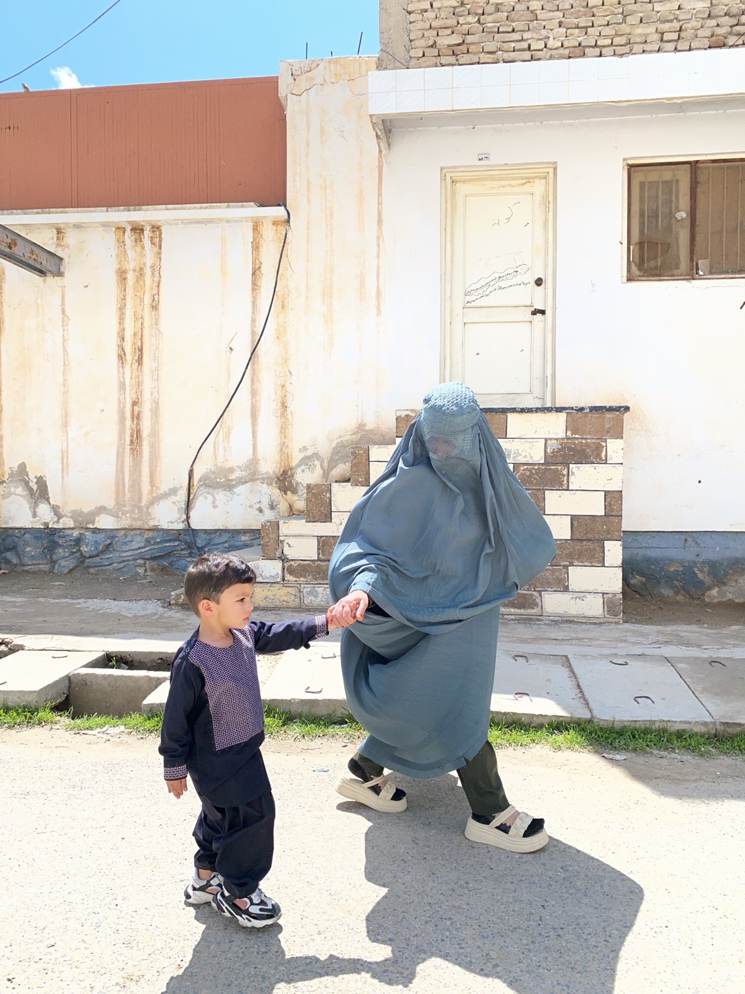 A woman clad in a blue burqa walks hand-in-hand with a young boy along a paved street in Kandahar, Afghanistan. The boy is dressed in a traditional dark blue suit with a patterned chest piece and matc…read more