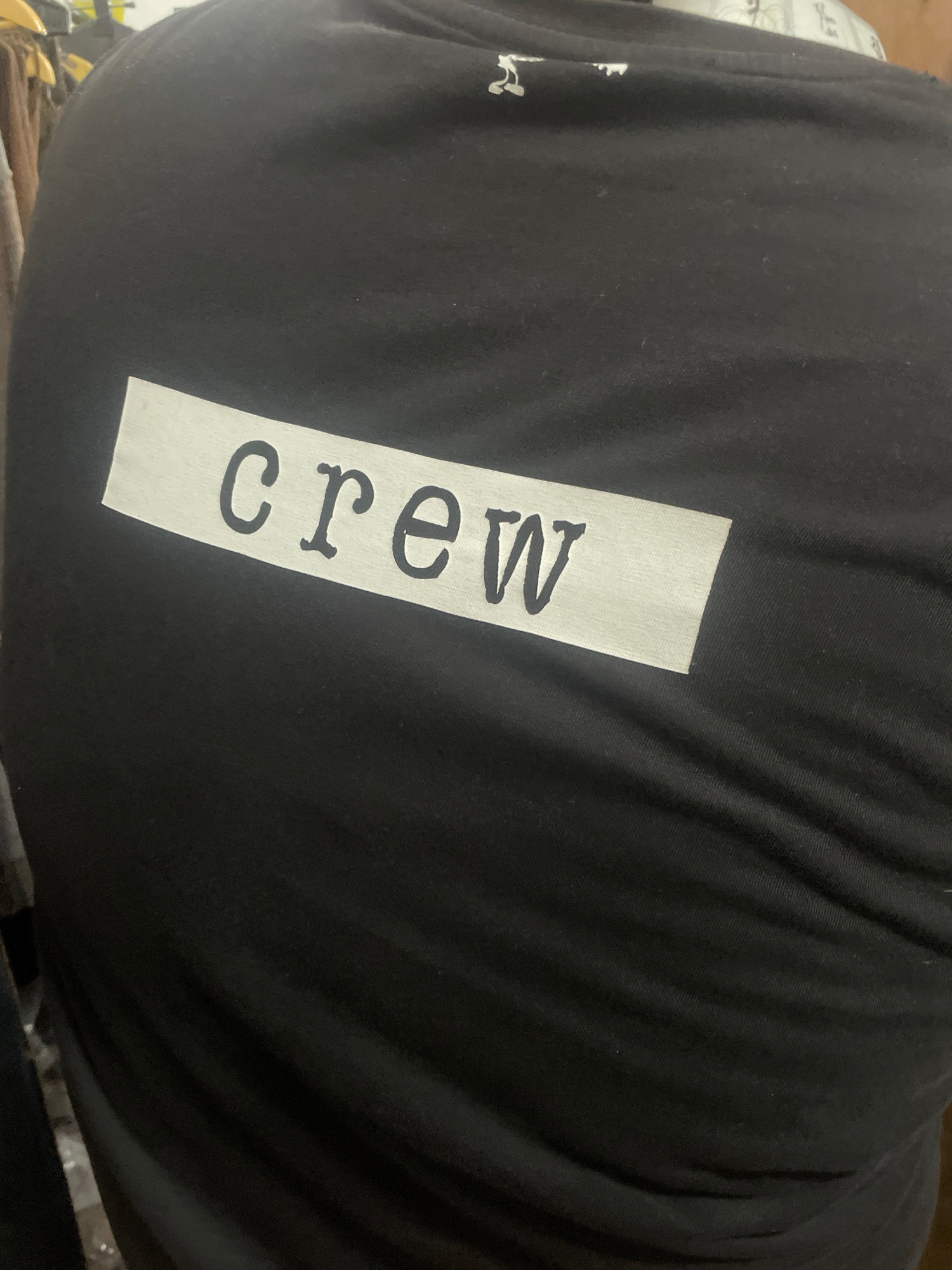 A black garment with the word "crew" printed vertically on a white patch is prominently displayed. The fabric of the garment appears to have some folds or creases. The surroundings are somewhat indist…read more