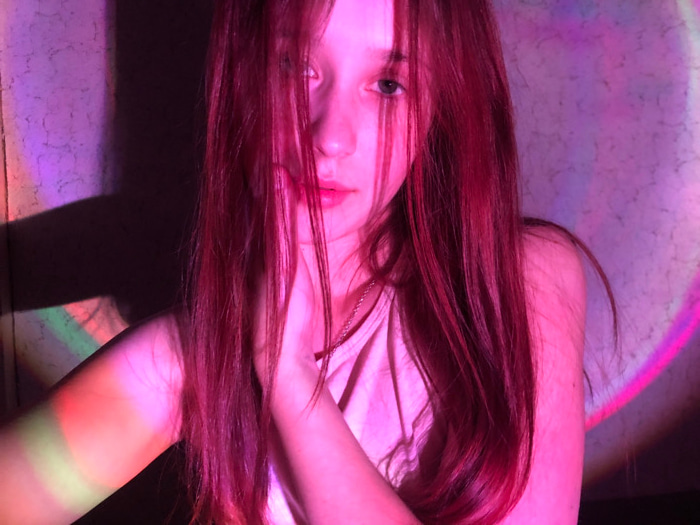 The scene is an indoor setting in the city of Фоки, Russia. A young female subject, with long, straight hair appearing reddish-purple due to strong artificial lighting, is positioned facing the camera…read more