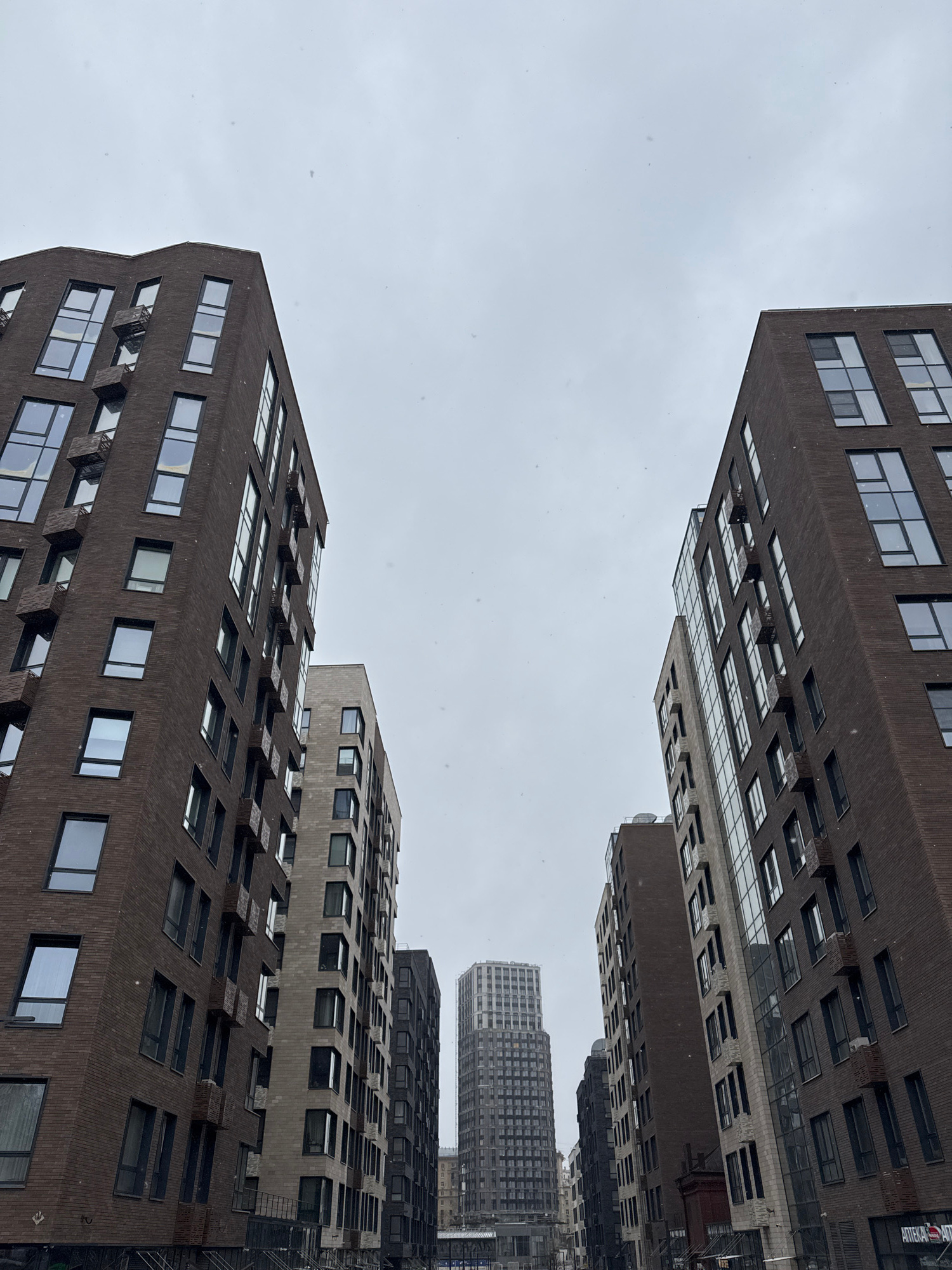 The image shows a view looking up at several buildings in Moscow, Russia. The buildings are modern and constructed with dark brick facades and numerous rectangular windows. The sky is overcast, sugges…read more