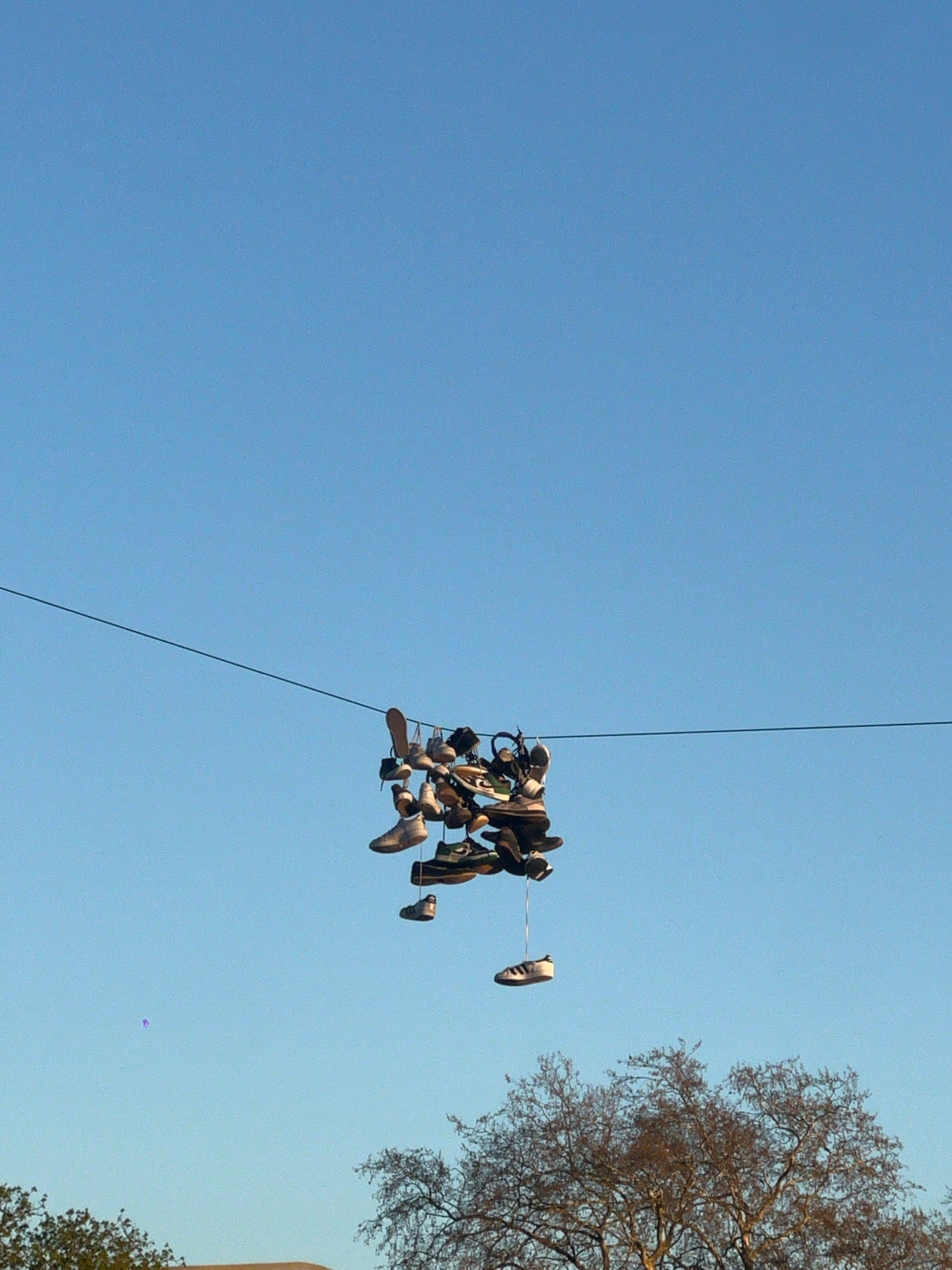 The image shows a low-angle view of a clear, bright blue sky with a few objects suspended from a dark overhead wire. A cluster of shoes, mostly sneakers and casual footwear, is visible hanging from th…read more