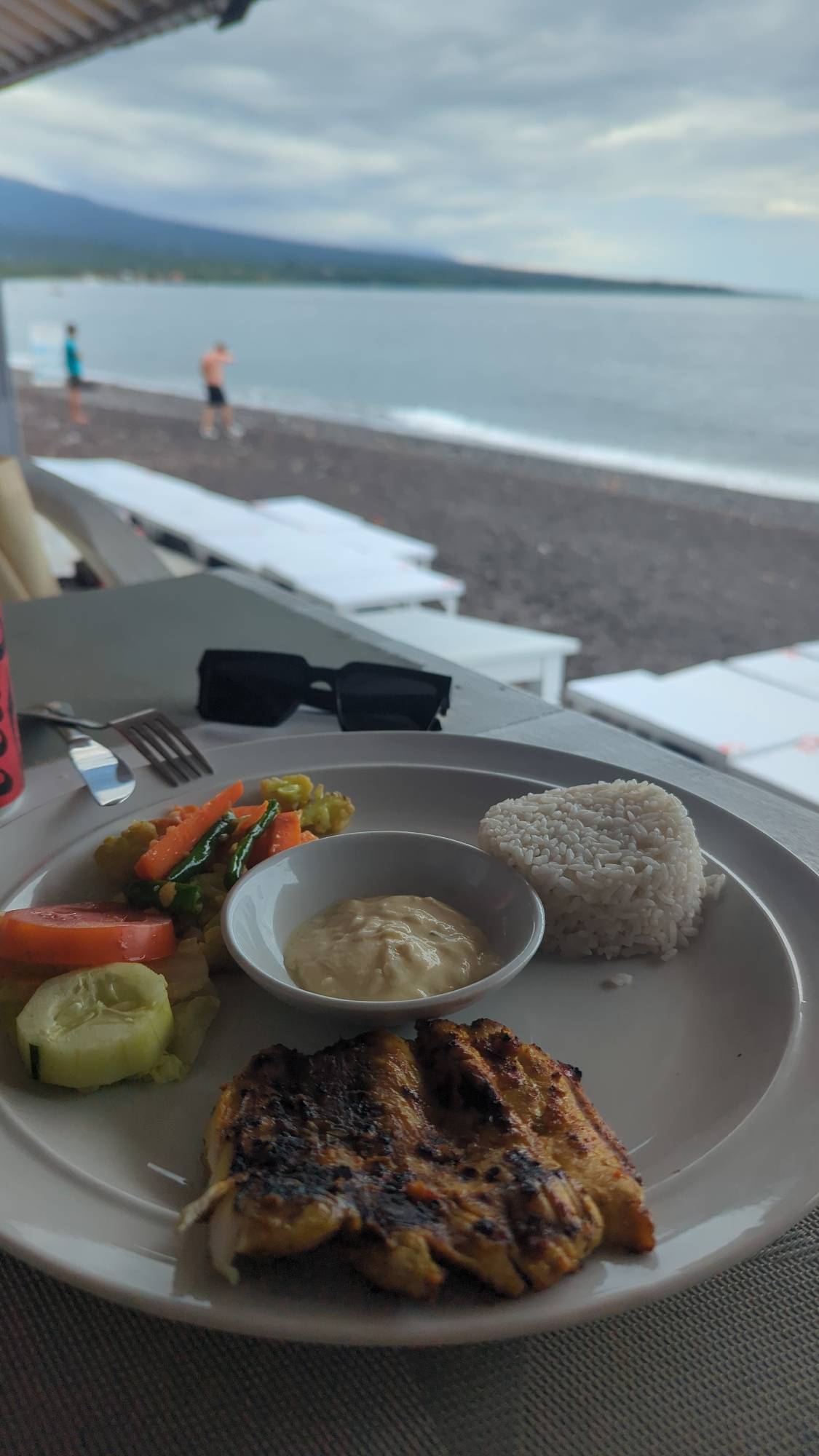 A vertically oriented image captures an outdoor dining scene with a scenic coastal view. In the foreground, a white round plate holds a meal consisting of a piece of grilled chicken with visible char…read more