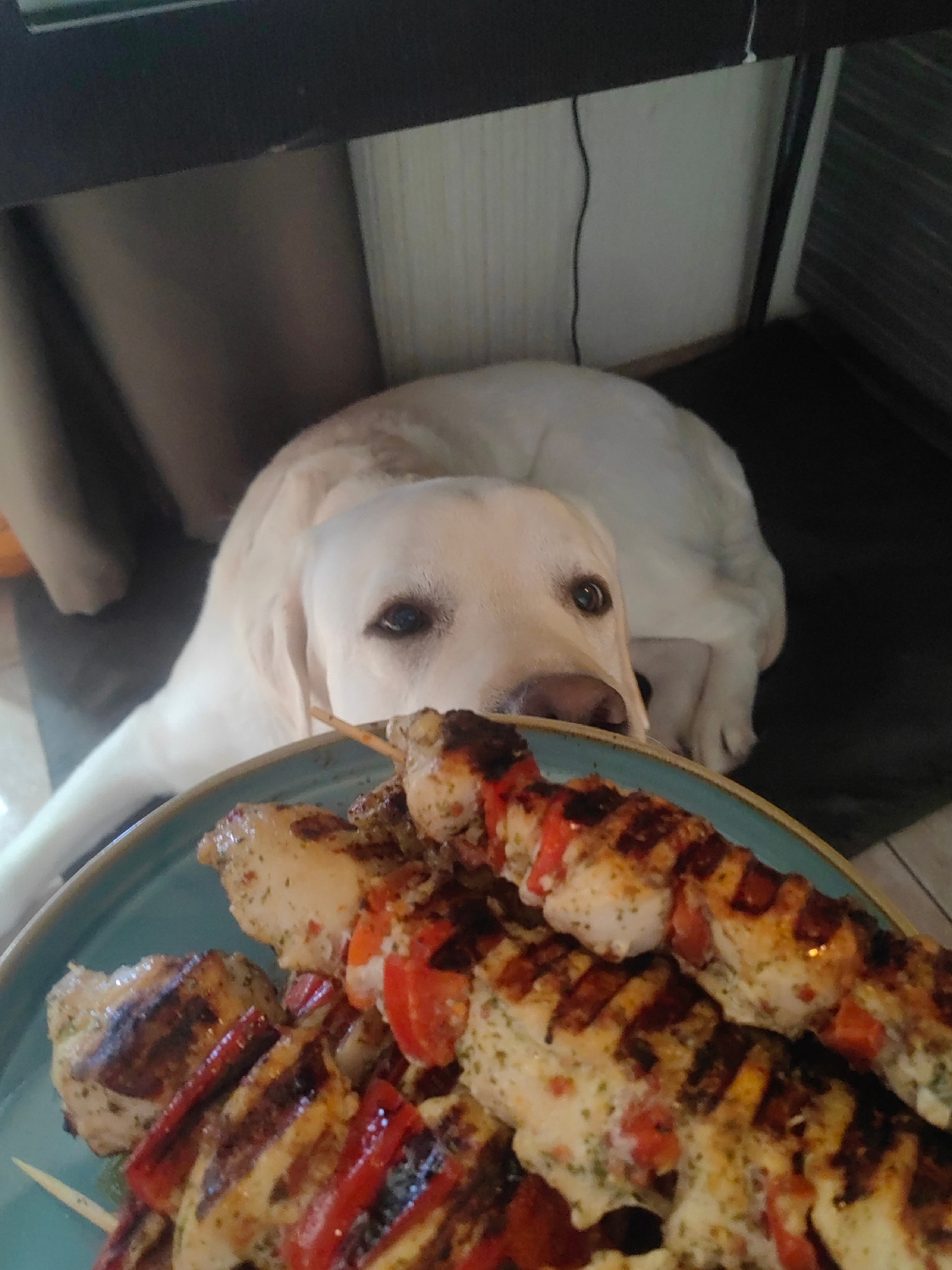 The image features a light-colored Labrador Retriever dog intently focused on a plate of food. The dog's head is positioned in the foreground, with its dark, expressive eyes fixed on the skewers place…read more
