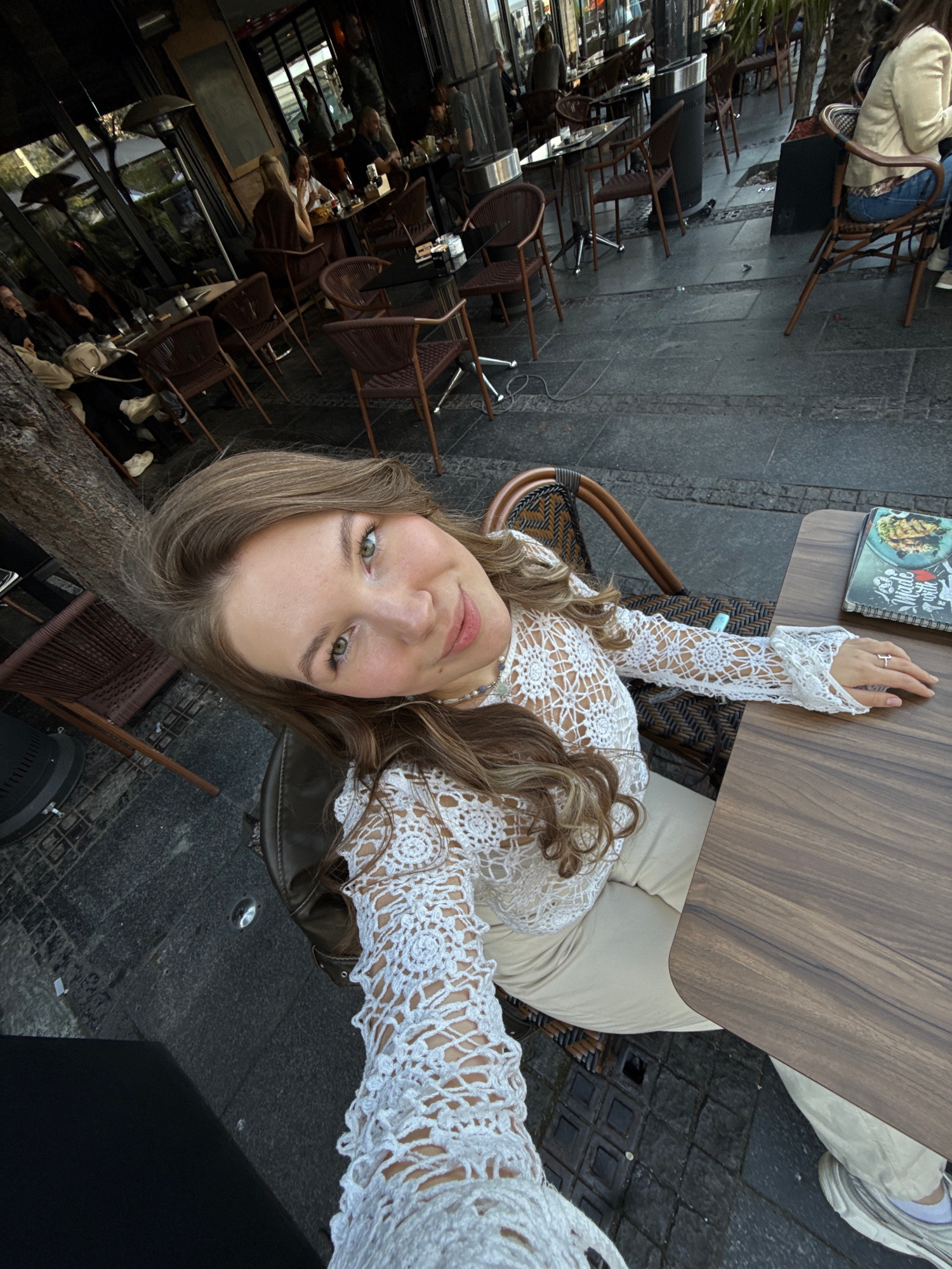 A young woman with long brown hair, wearing a white lace top and light-colored pants, is sitting at a table in an outdoor cafe. She is taking a selfie. A menu is on the table. Other patrons are seated…read more