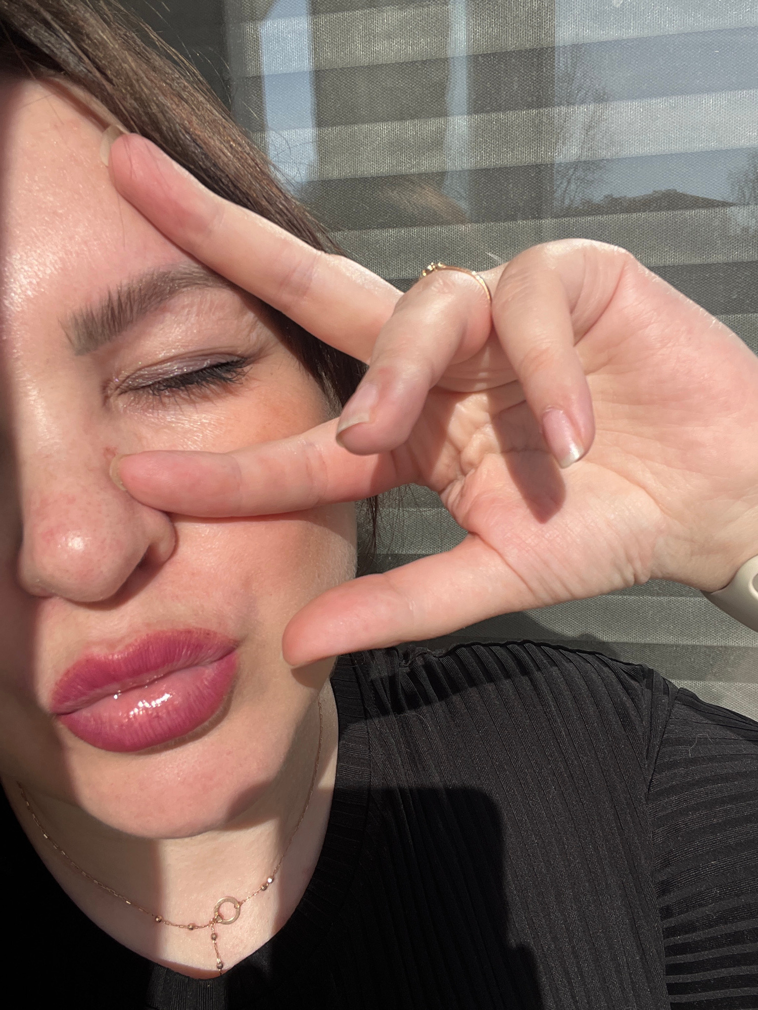 A close-up, slightly angled view depicts a person's face partially obscured by a hand. The person is lying down with their eyes closed. A hand is positioned above their face, with the fingers forming…read more