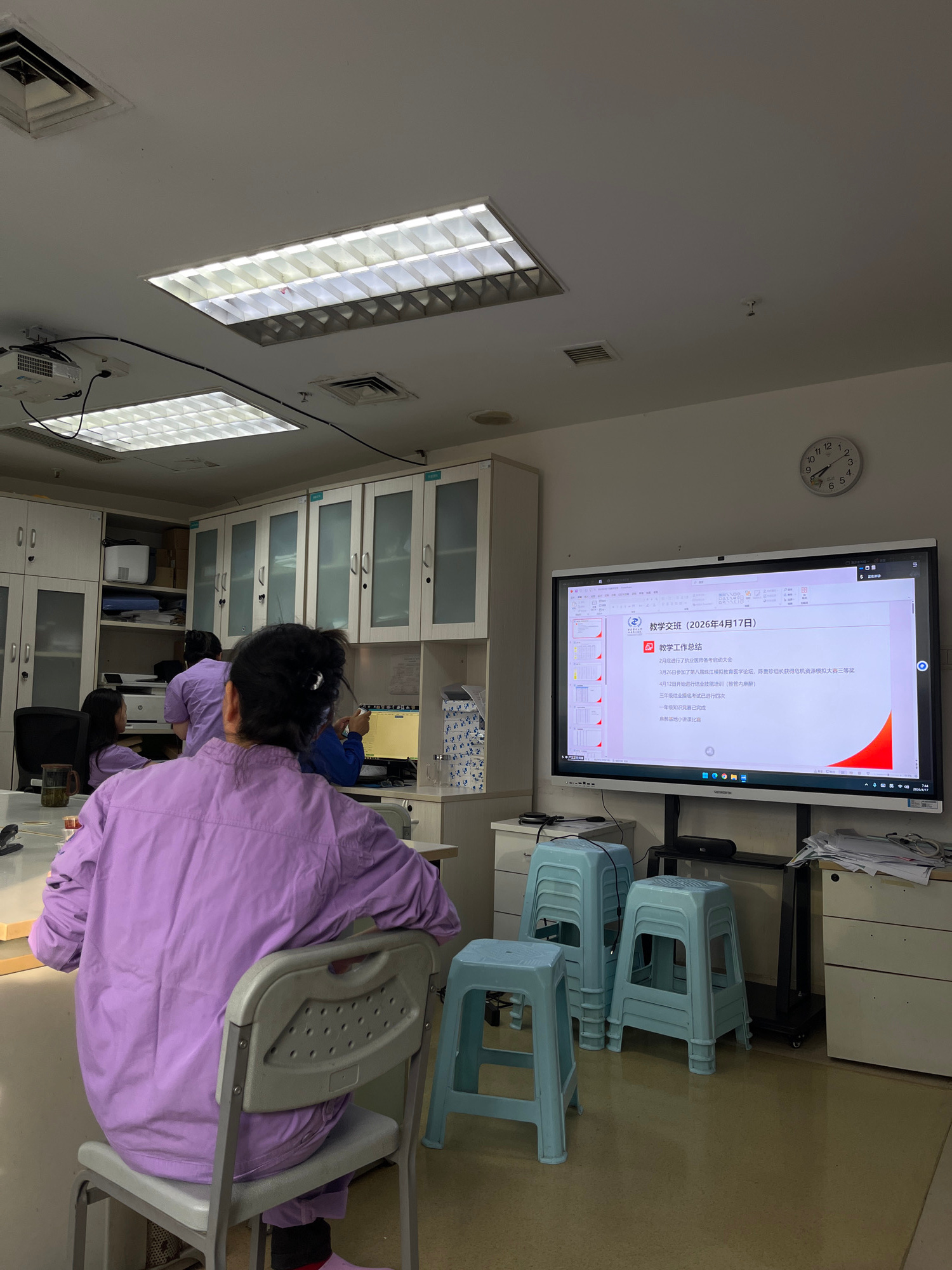 This media file depicts an indoor scene within what appears to be a medical training or meeting room, located in Yuzhong District, China. **Subjects:** The primary subject is a person in a purple scr…read more