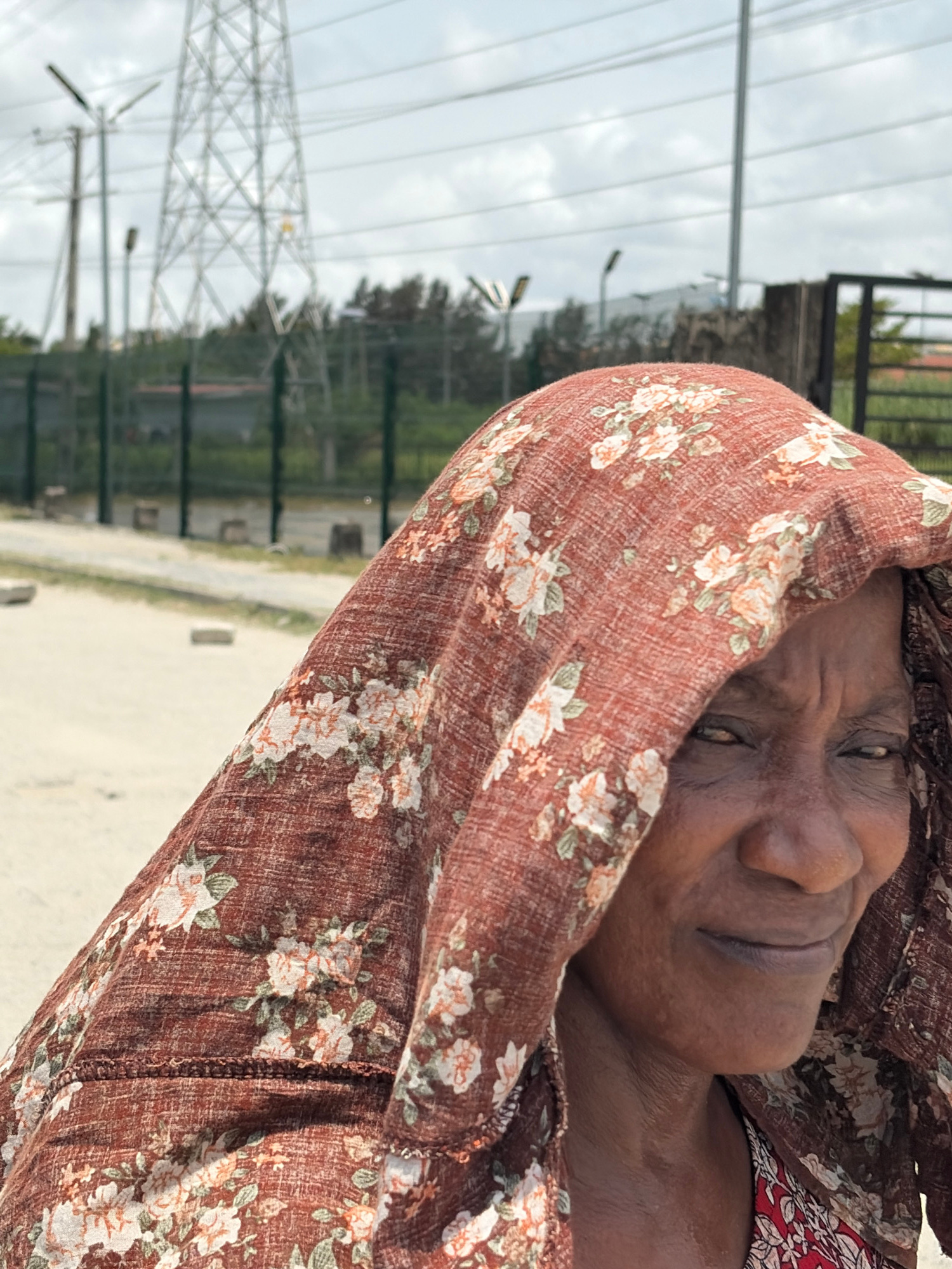 An elderly woman is depicted wearing a brown floral headscarf, with the cityscape of Igboefon, Nigeria, visible in the background. Infrastructure elements such as power lines and street lamps are also…read more