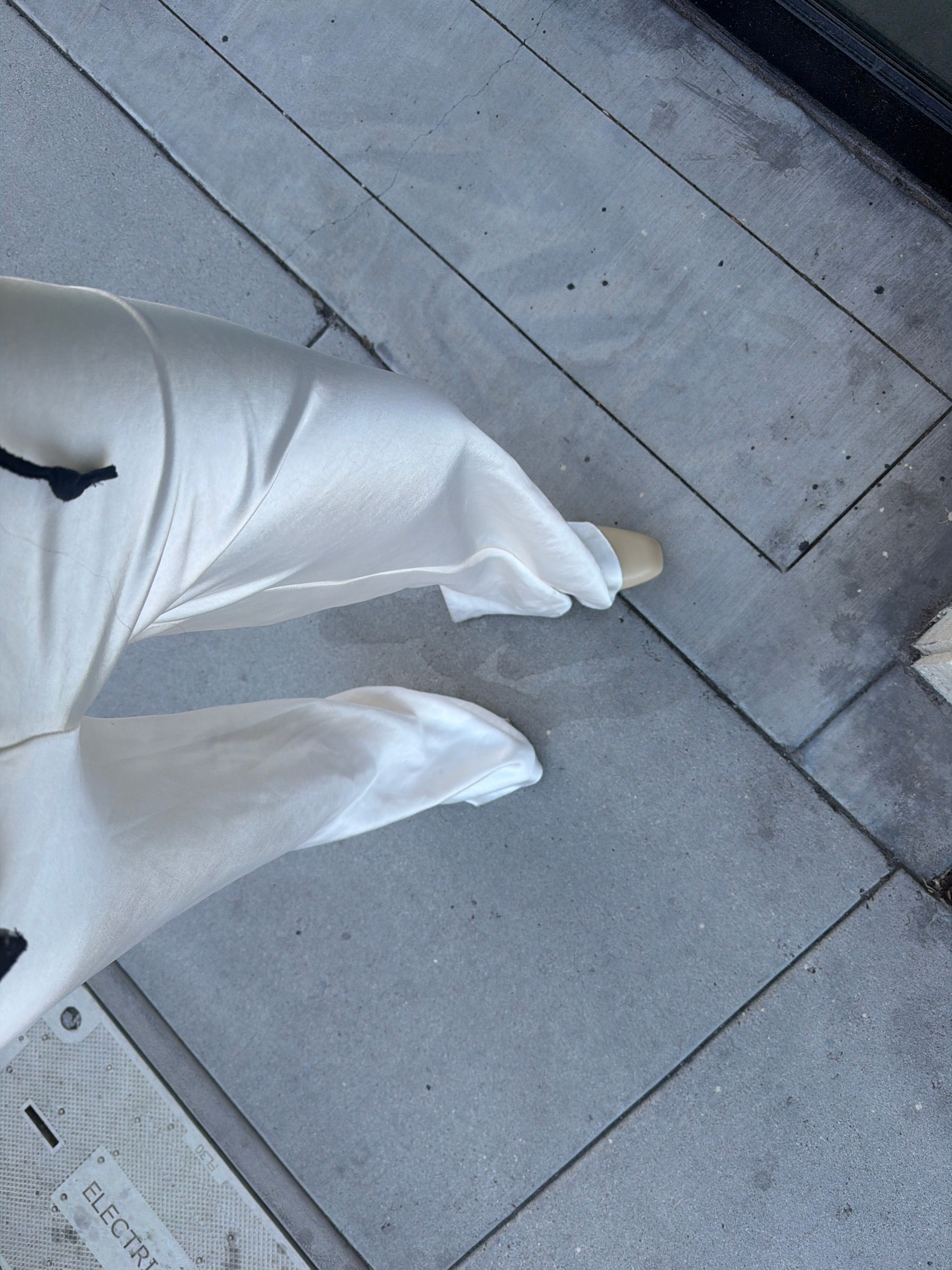 The image shows a first-person, eye-level view of a person standing on a sidewalk, likely in an urban setting. The person is wearing loose-fitting, white pants and a tan shoe is visible on the left fo…read more
