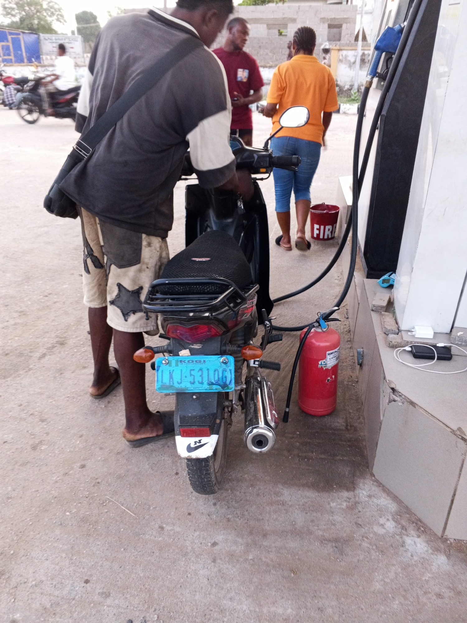 At a gas station in Adankolo, Nigeria, a man in a two-toned shirt and star-patterned shorts stands facing a black motorcycle. He appears to be filling the gas tank. The motorcycle has a blue license p…read more