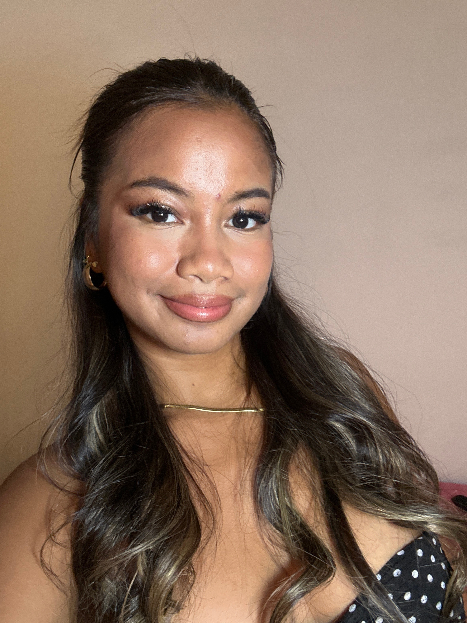 A woman with dark hair is facing the camera. She has light brown skin, dark eyes, and full lips. She is wearing a gold necklace and gold hoop earrings. She is wearing a black and white polka dot top.…read more