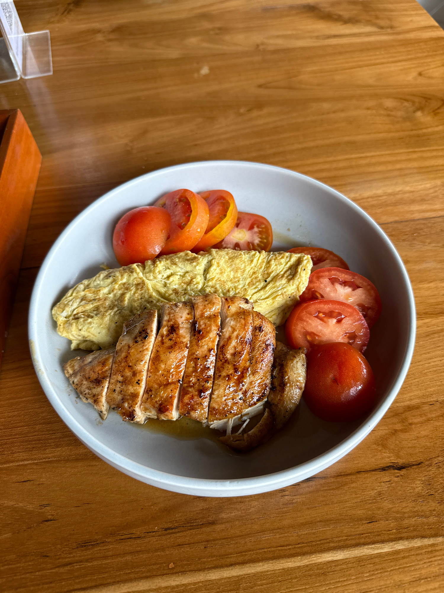 A high-angle, medium shot shows a white bowl filled with food placed on a wood-grained table. The food consists of sliced tomatoes, an omelet, and sliced grilled chicken. The tomatoes are mostly round…read more
