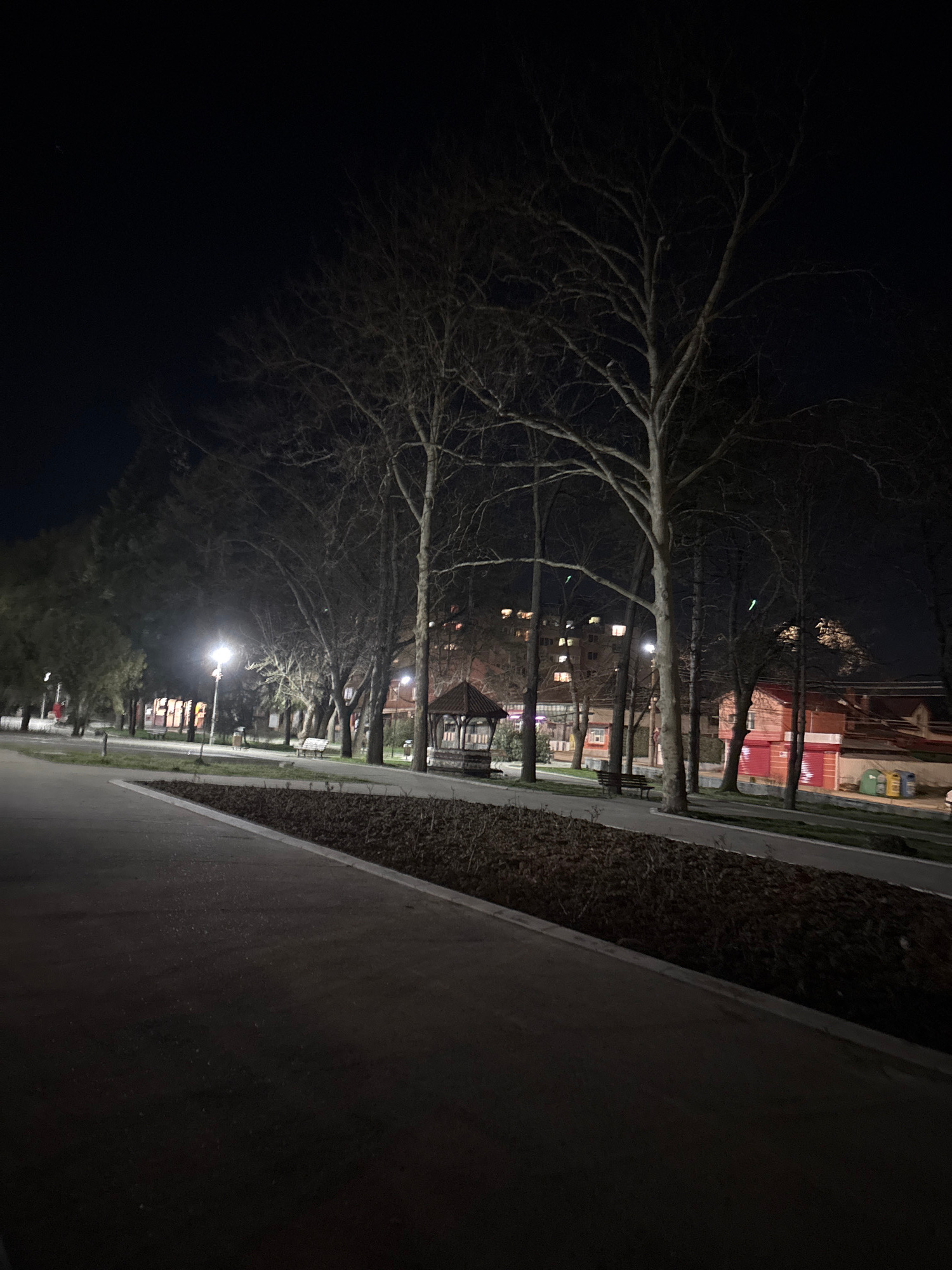 The image depicts a nighttime scene within a public park or green space in Tutrakan, Bulgaria. The foreground features a dark, paved pathway, running diagonally from the lower left towards the mid-rigβ¦read more