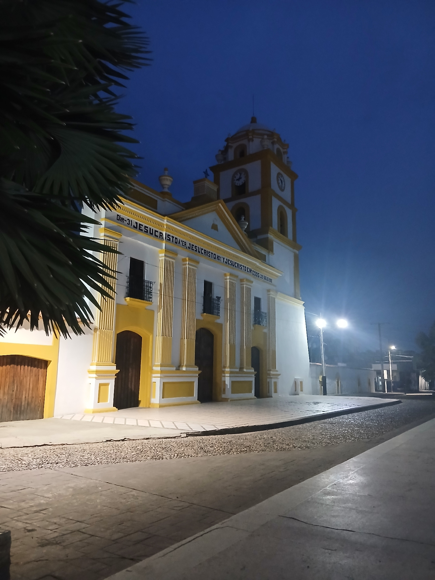 The image captures a brightly lit, ornate church in Tinaco, Venezuela at night. The church is painted primarily white with yellow trim and features a tall bell tower with a clock visible at the top. T…read more