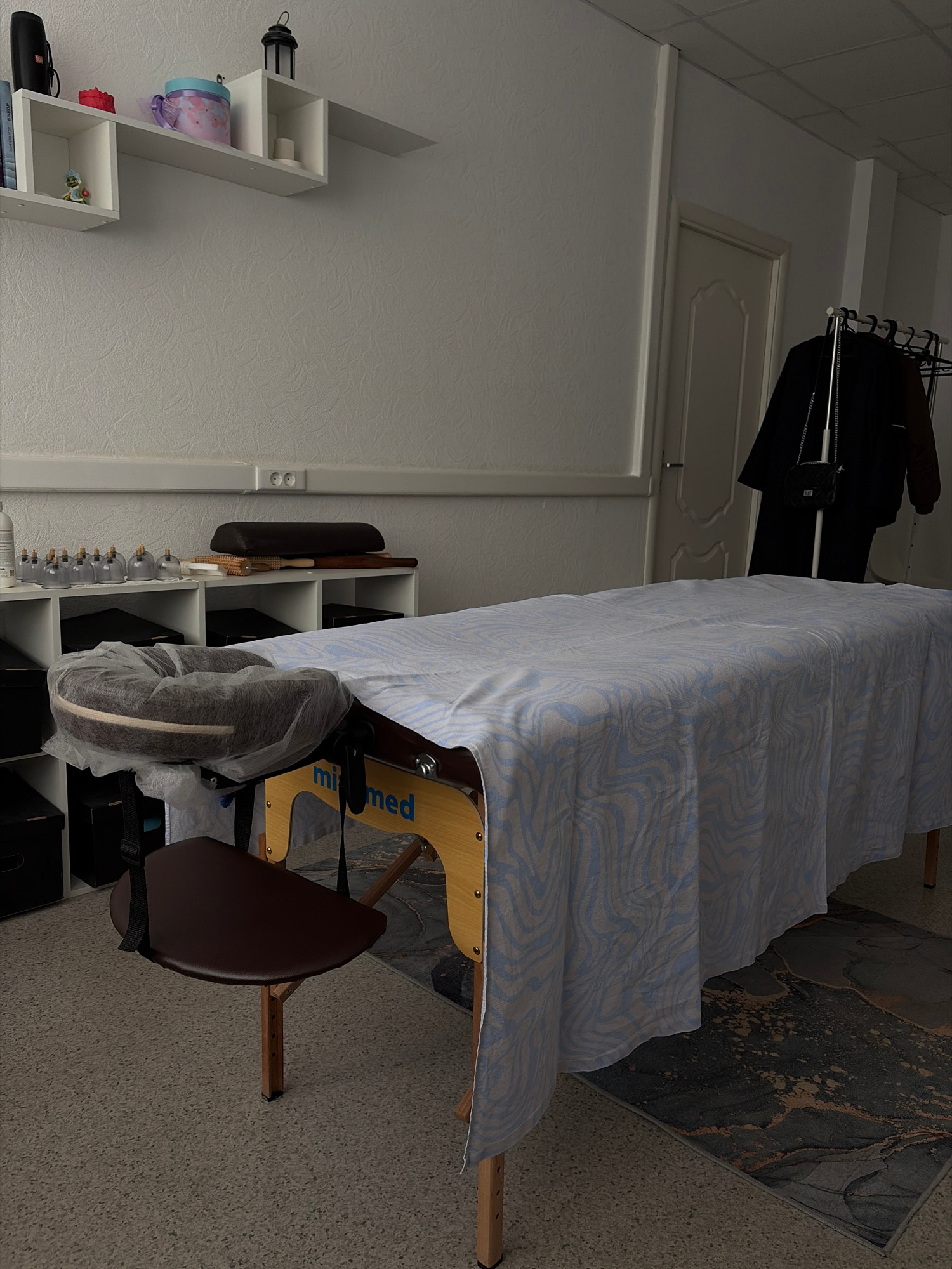 A commercial massage table occupies a room, possibly in Chaikovsky, Russia. The table is covered with a blue and white patterned sheet, and a massage chair is positioned adjacent to it. Shelving units…read more