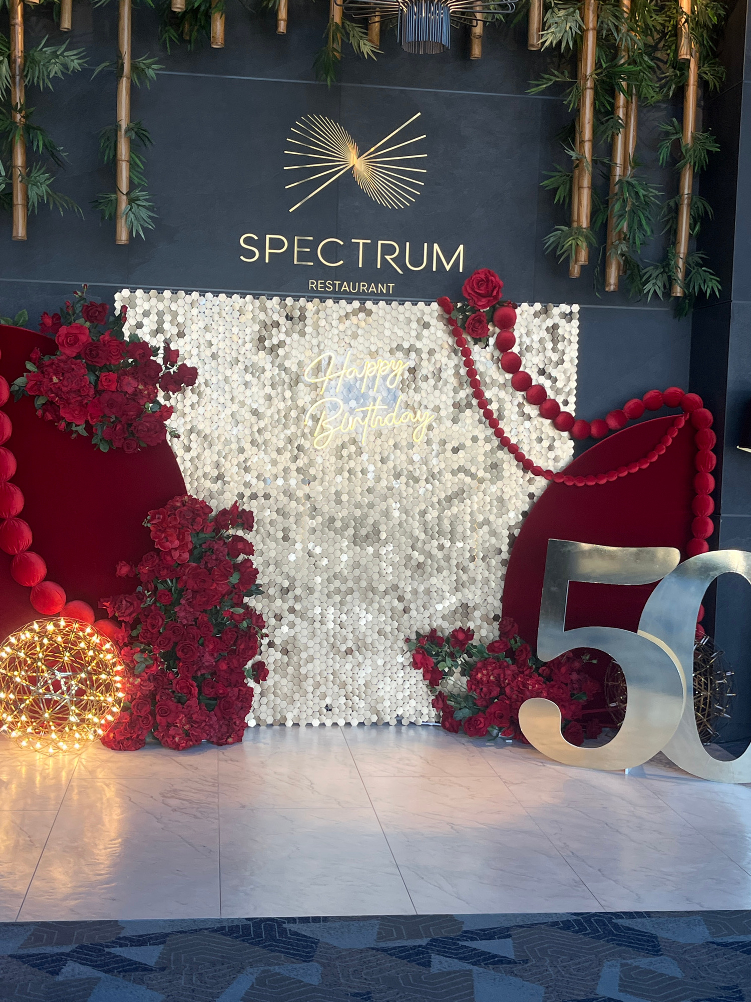 The image shows a wall decoration at the Spectrum Restaurant, likely located in Sofia, Bulgaria, based on the restaurant name. The wall is decorated with a dark gray panel featuring the restaurant's nā¦read more