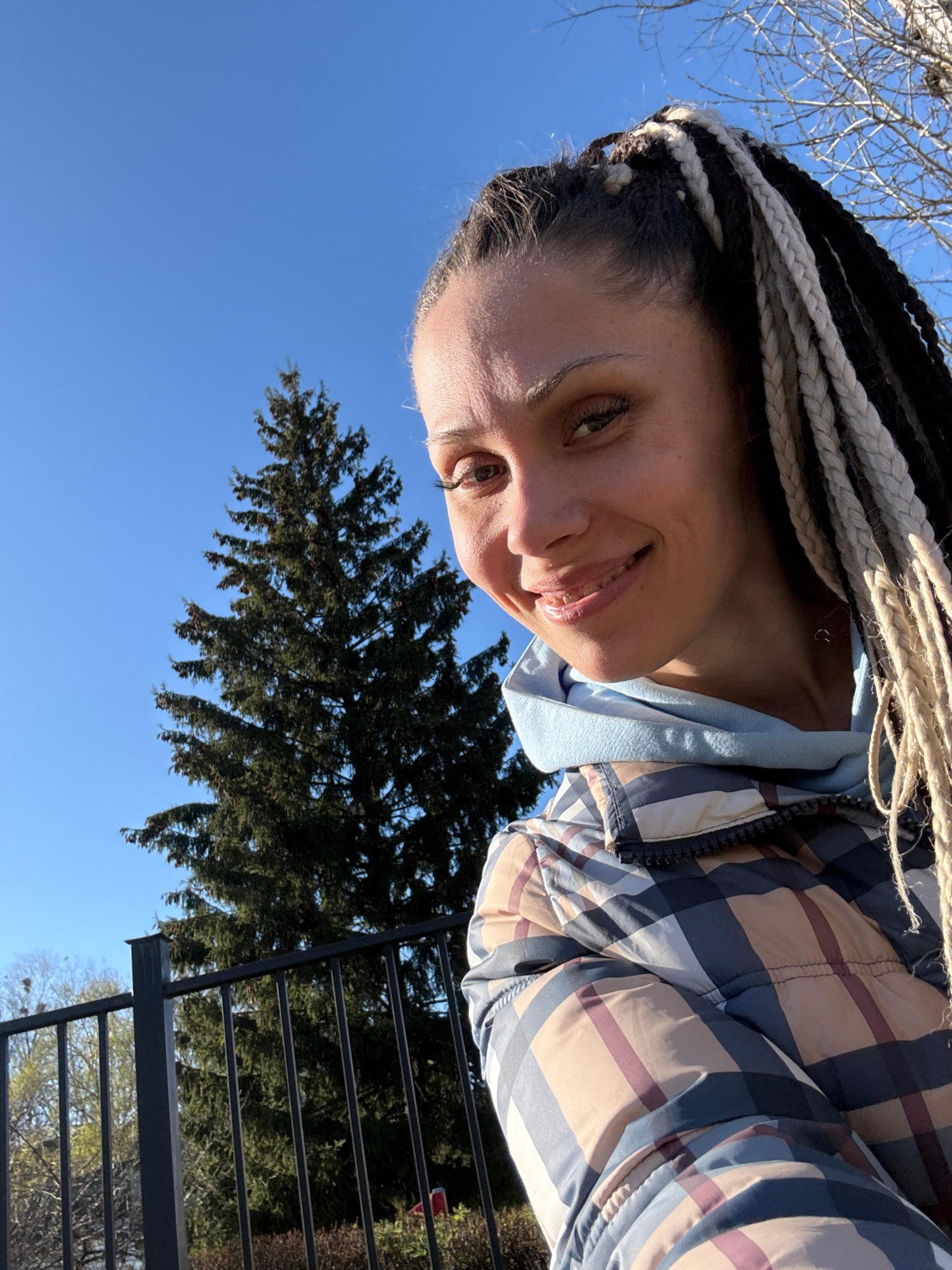 A young woman with black and light-colored dreadlocks is captured in a close-up, upward-angled portrait under a clear blue sky. She is smiling softly, showing a pleasant and relaxed expression, with h…read more