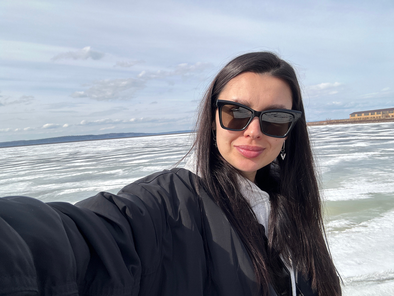 A woman with long dark hair is posing for a selfie against a backdrop of a body of water and a partly cloudy sky. She is wearing sunglasses and a dark jacket. In the distance, a building is visible. T…read more