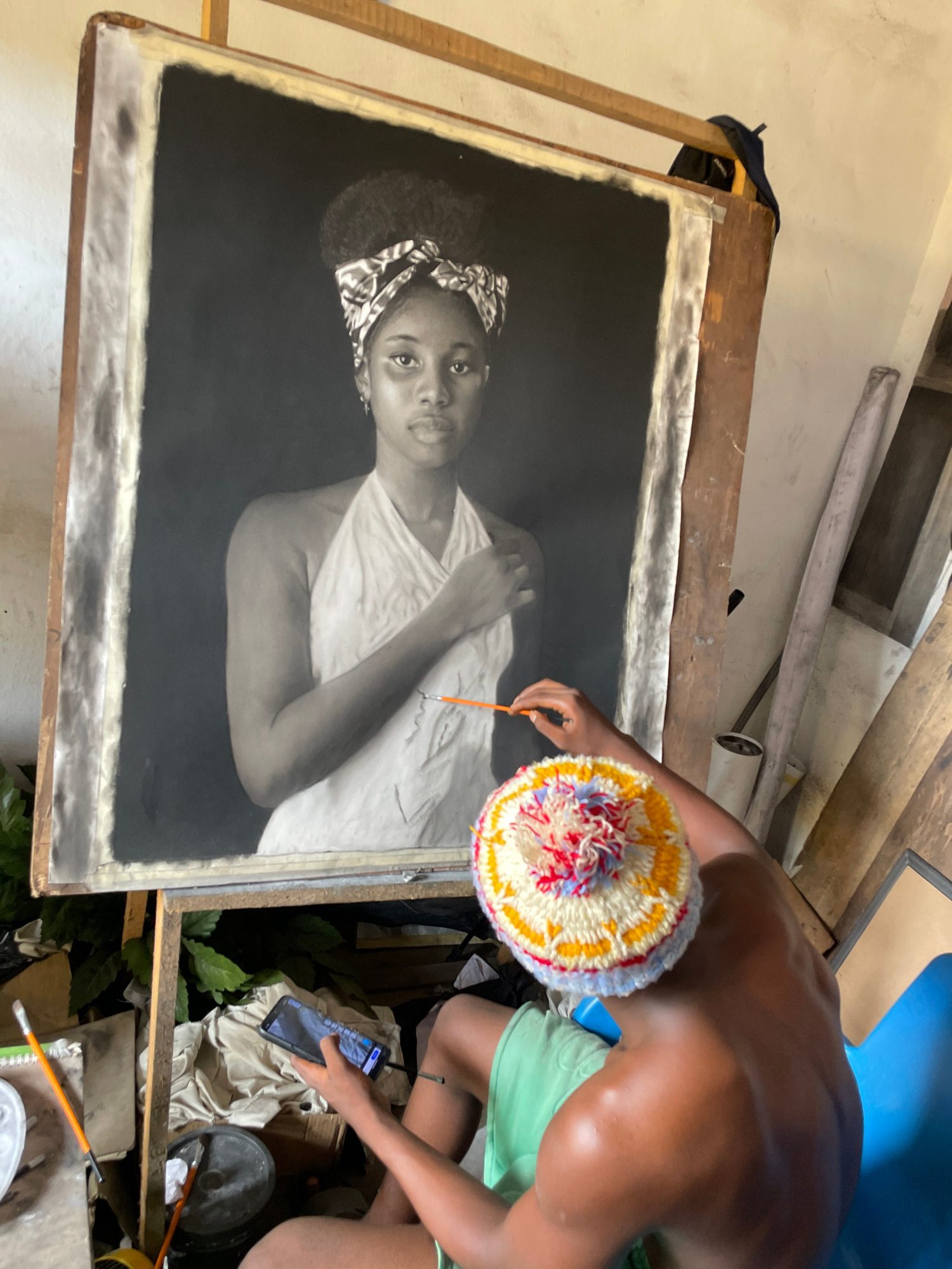The image shows an artist working on a charcoal portrait of a young woman. The portrait is on an easel and the artist, a dark-skinned individual wearing a colorful crocheted hat and green shorts, is t…read more
