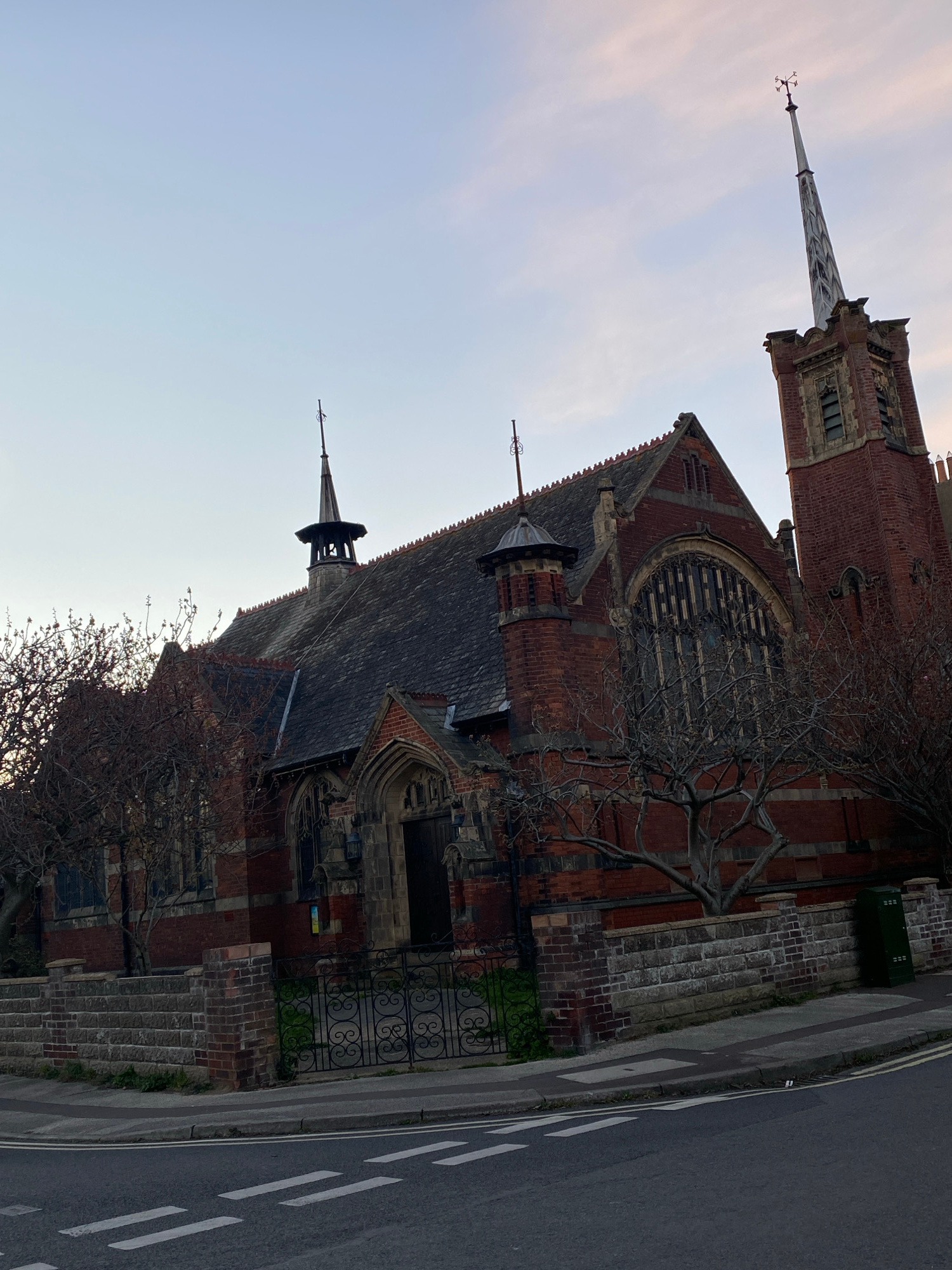 The image captures an architectural structure, primarily constructed of red brick. A prominent steeple rises high, topped with a weather vane. An arched window is a focal point of the building, partia…read more