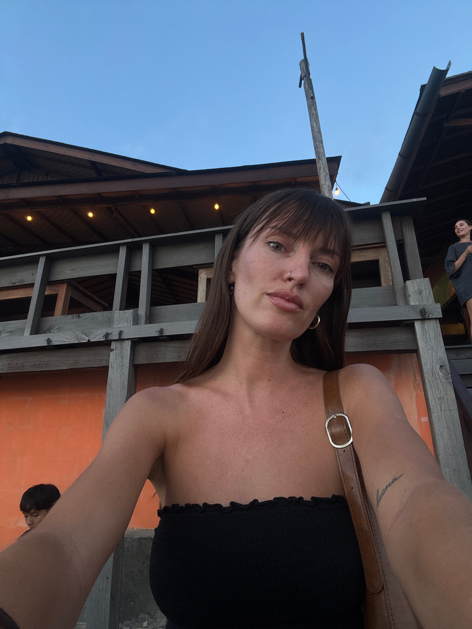A low-angle selfie shot depicts a woman with dark hair and bangs, wearing a black strapless top and a brown leather strap. She has a nose ring and is wearing earrings. Behind her, an outdoor wooden stβ¦read more