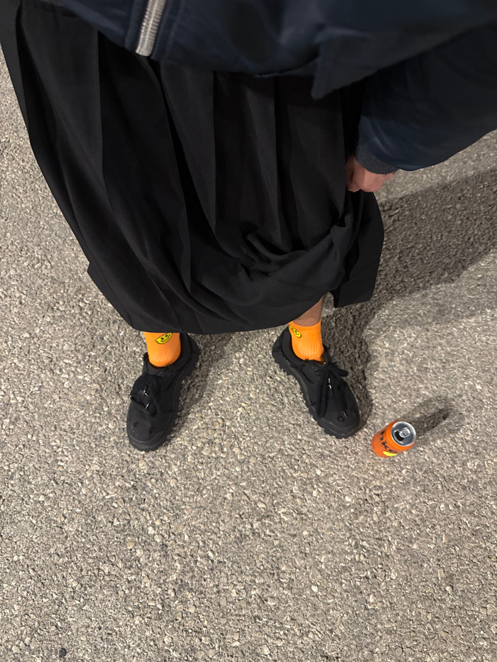 A person wearing black shoes and orange socks stands on asphalt near an open orange can. The person wears voluminous black pants or a skirt and a dark blue jacket. The ground is mottled gray. The imag…read more