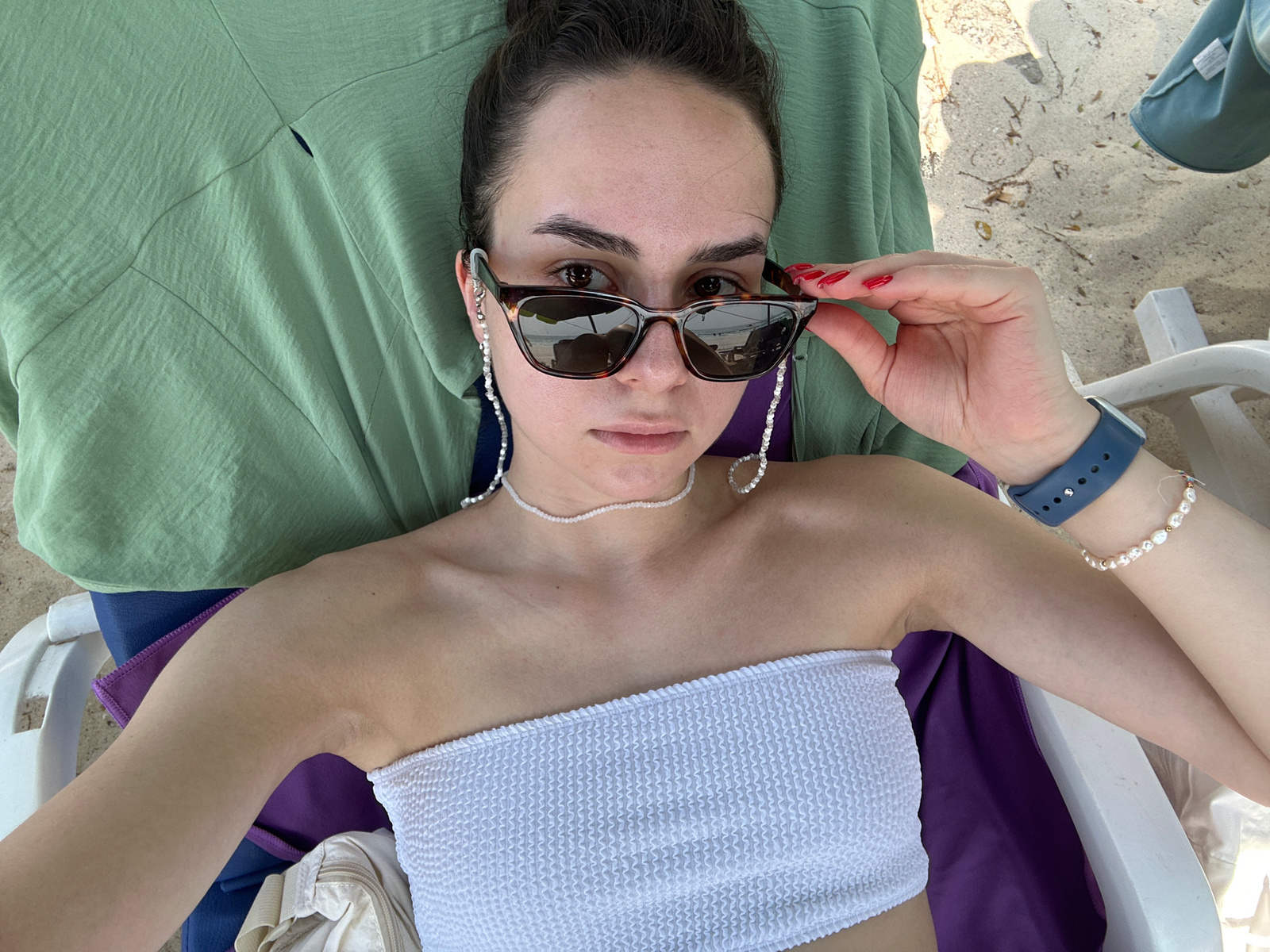 A woman lies supine outdoors, likely on a lounger. She wears a white, textured bandeau top and an olive green garment. Her arms are raised, one holding tortoiseshell sunglasses with a beaded chain. Sh…read more