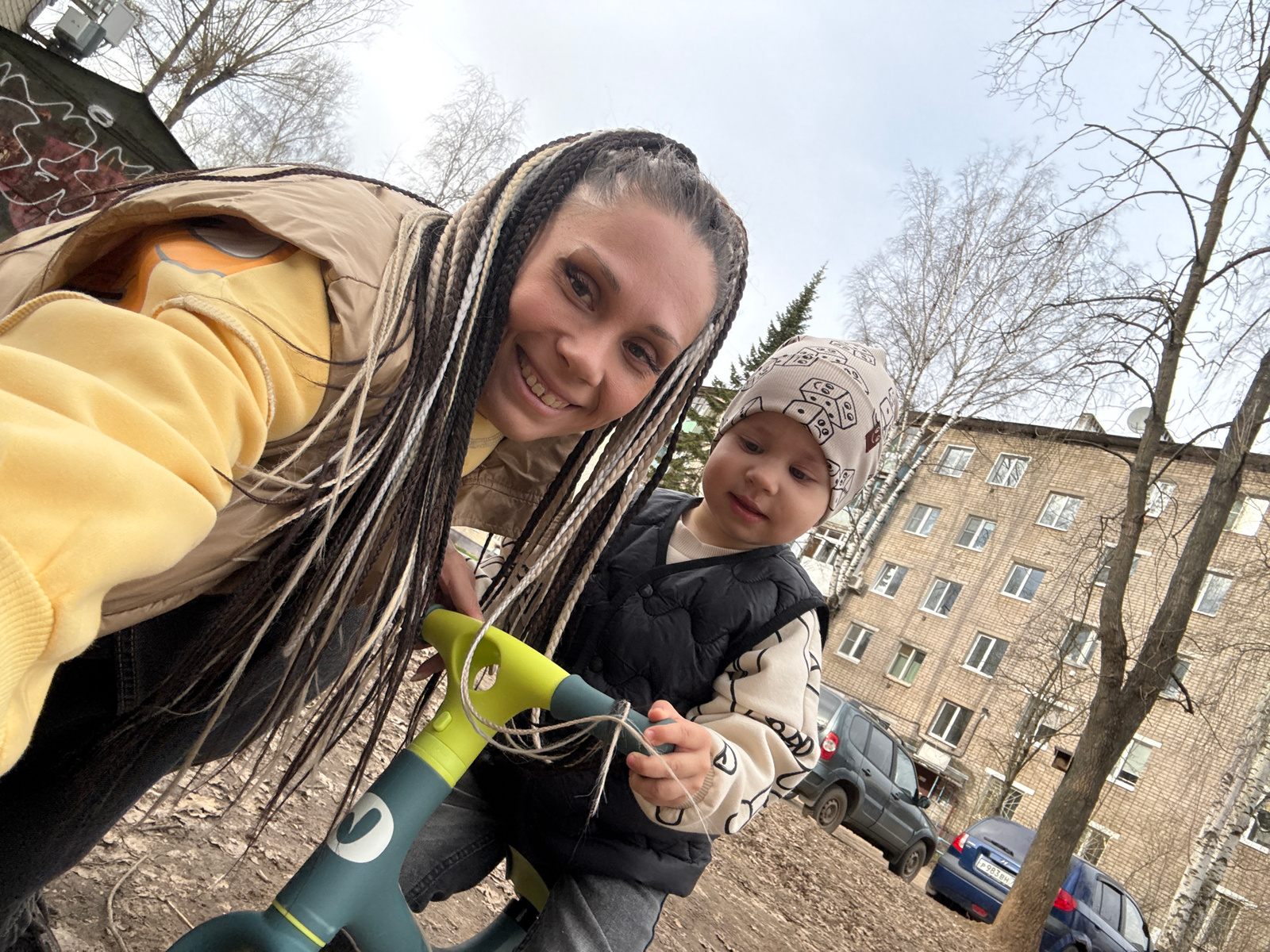 A woman and a young child are outdoors, likely in a park or residential area in Rusanovo, Russia. The woman has braided hair and is wearing a yellow sweatshirt and a light-colored jacket. The child we…read more