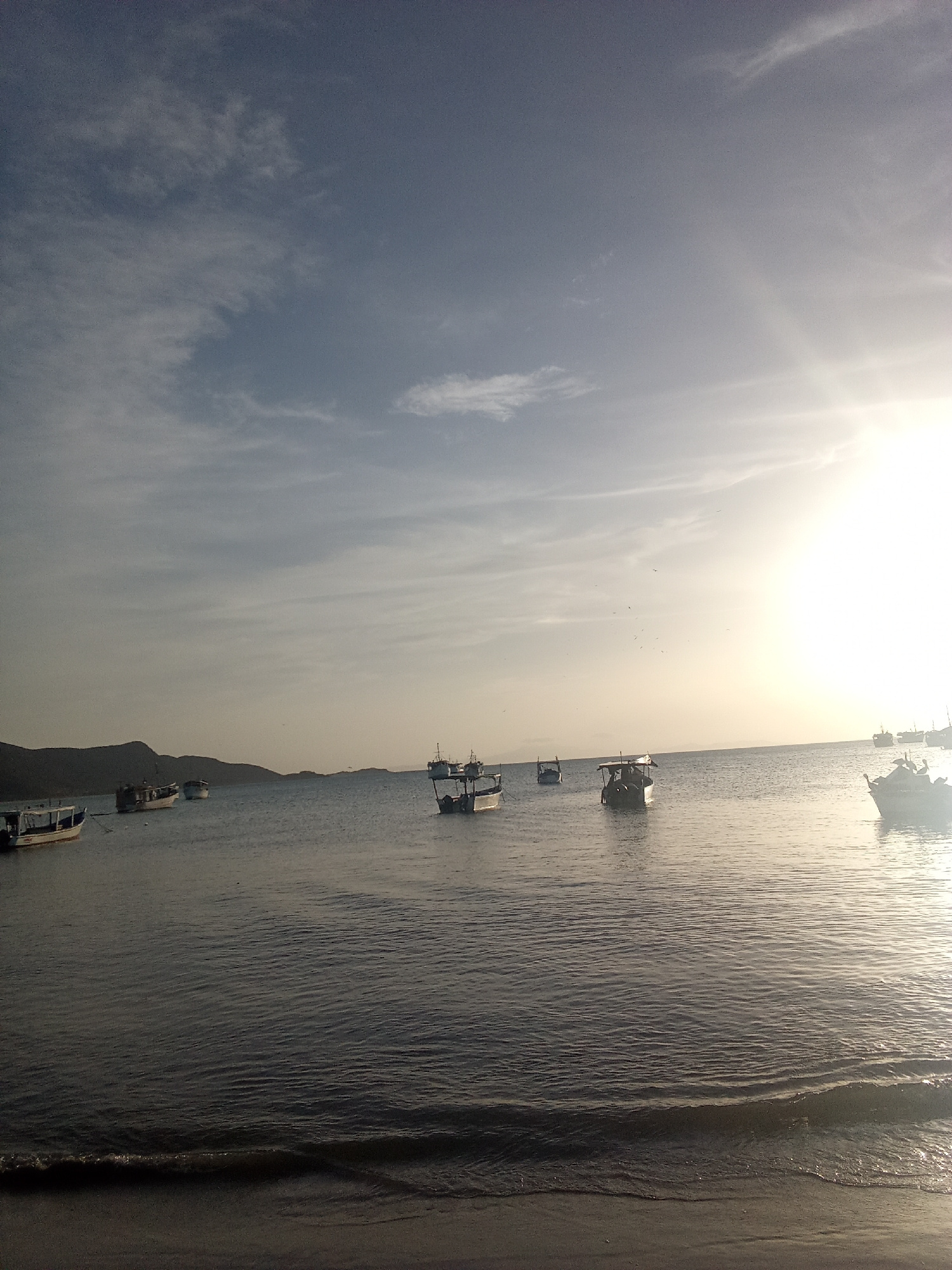 The image captures a tranquil scene at what appears to be a beach in Juan Griego, Venezuela. The sky is partly cloudy with the sun shining brightly on the right side. Several small fishing boats are s…read more