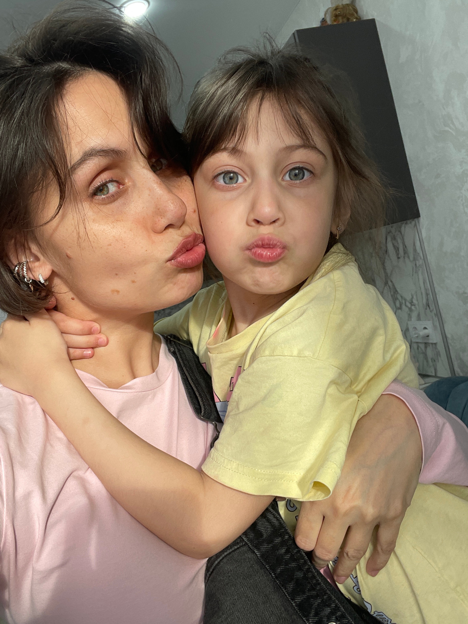 Two people, likely a young child and an adult female, are lying down and posing for a photo. The child, wearing a yellow shirt, is on top, with her face close to the camera and lips puckered. She has…read more