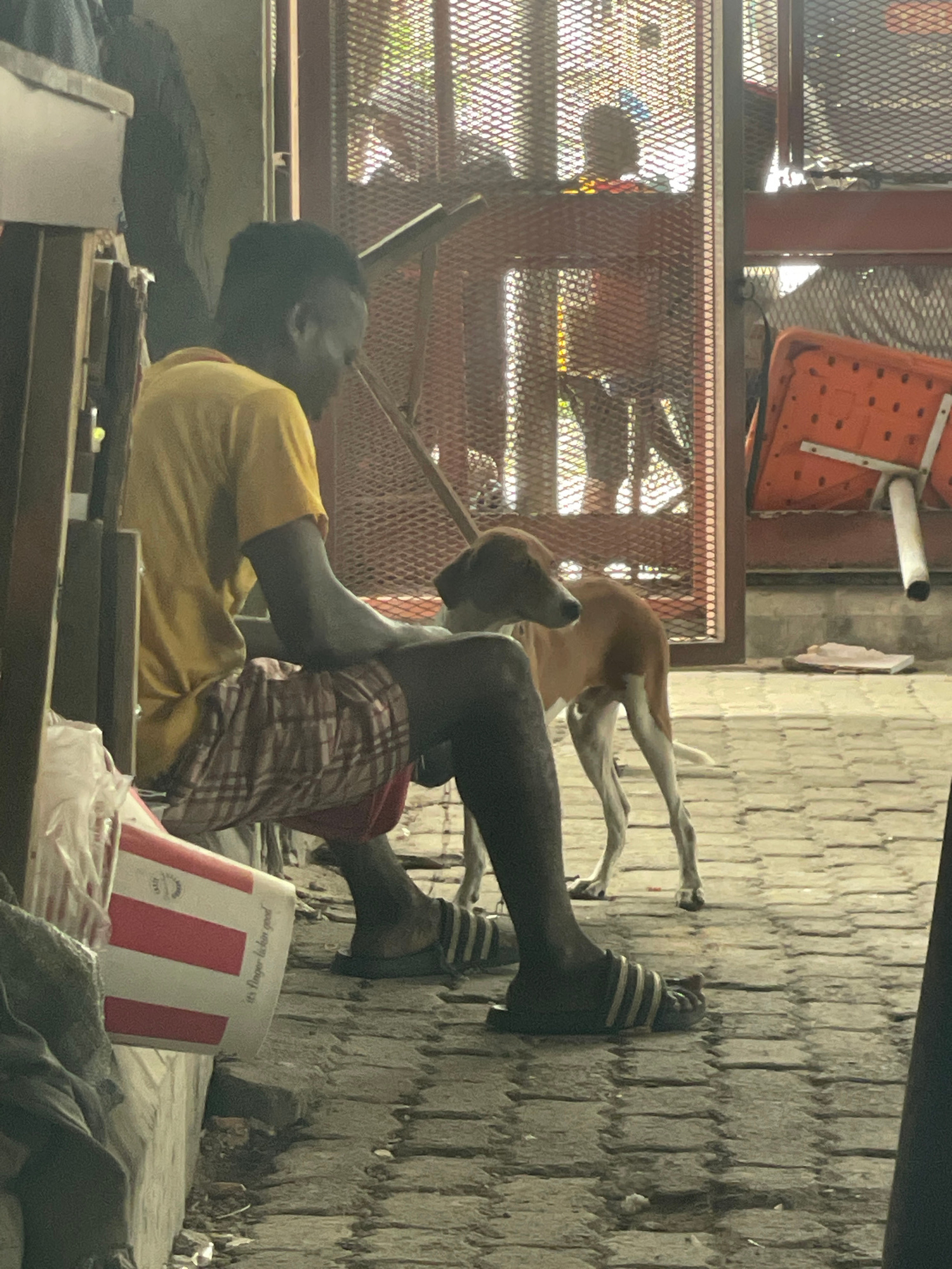 A man is lying down, with his legs propped against a brick wall. A dog is standing behind the man with its front paws on his body. The man is wearing a yellow shirt and plaid shorts. He is wearing str…read more