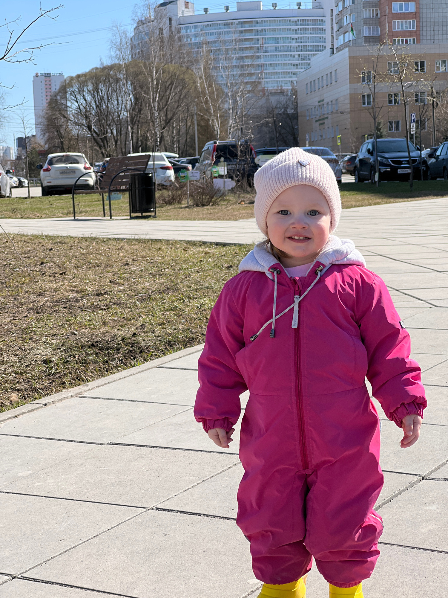 A young child in a pink snowsuit and yellow boots stands on a light gray, textured concrete sidewalk. The child is facing the viewer and smiling, wearing a light pink knit hat. The background features…read more