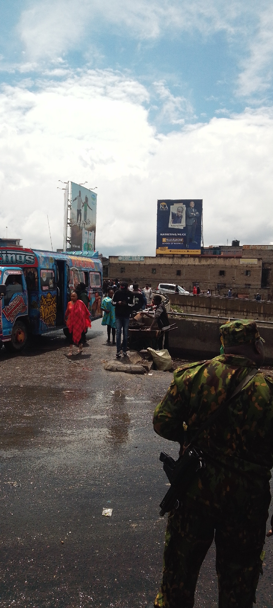 The image captures a street scene in Nairobi, Kenya, likely during or shortly after a rainfall, as evidenced by the wet asphalt. A colorful "matatu" (a privately-owned minibus) is parked to the left,…read more