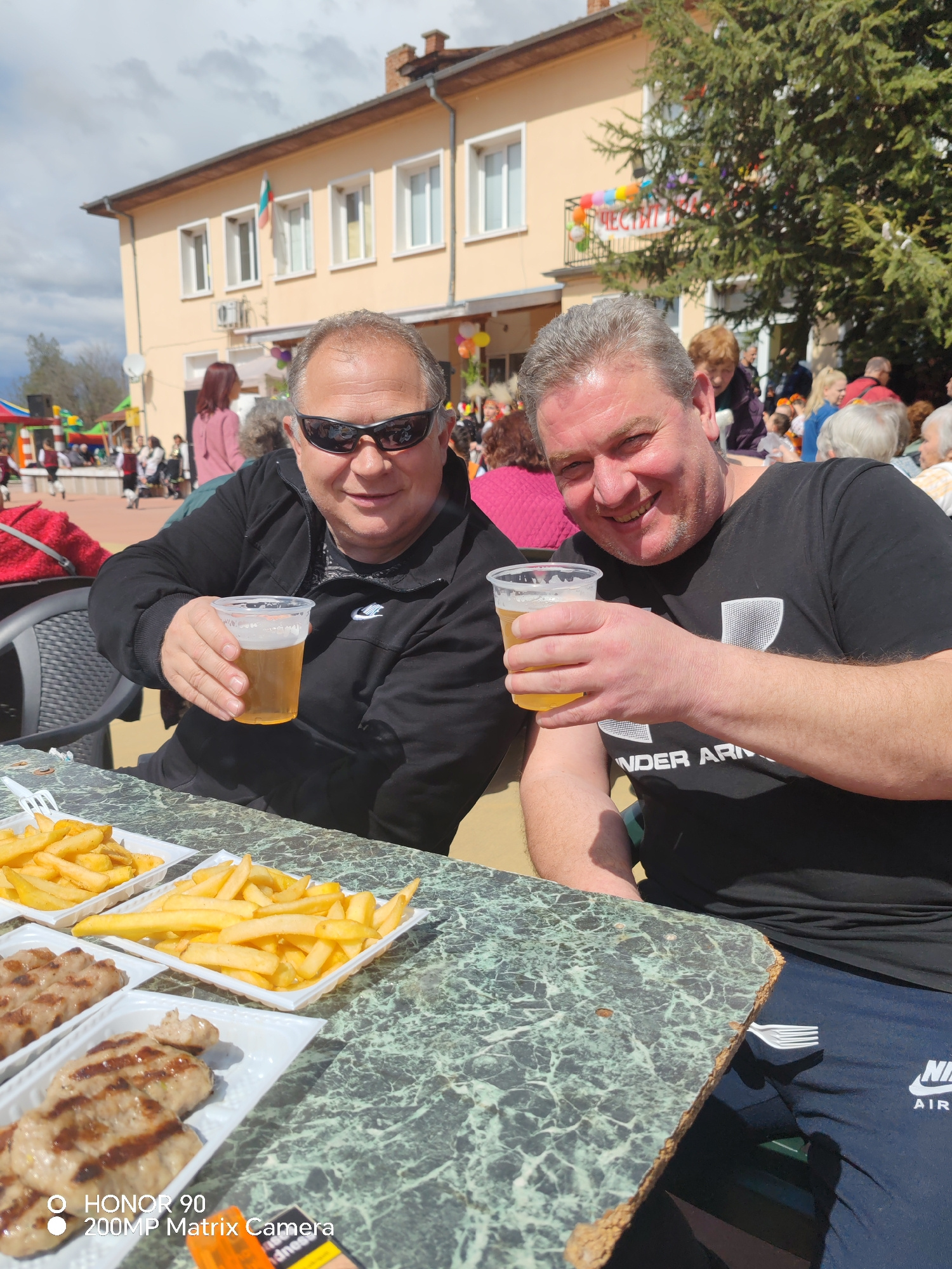 Two men sit at a table outdoors, holding plastic cups filled with a golden liquid. The man on the left wears sunglasses and a black jacket. The man on the right smiles and wears a black Under Armour t…read more