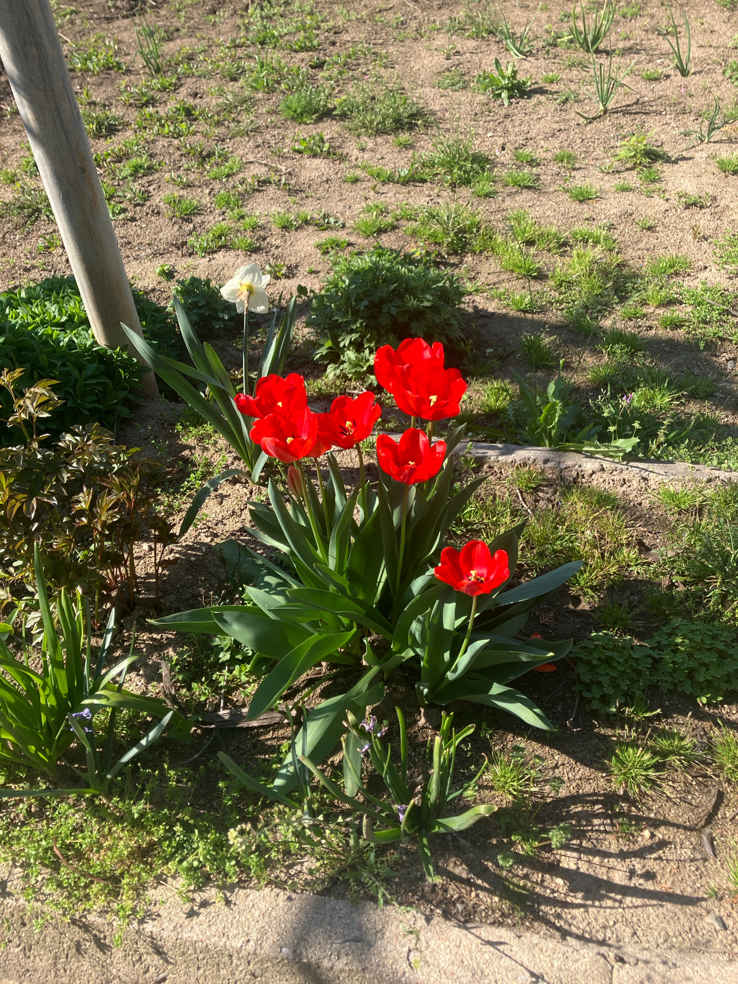 The image shows a cluster of red tulips and one white daffodil growing in a garden. The garden bed has patches of grass and other small plants surrounding the flowers. A wooden beam borders part of th…read more