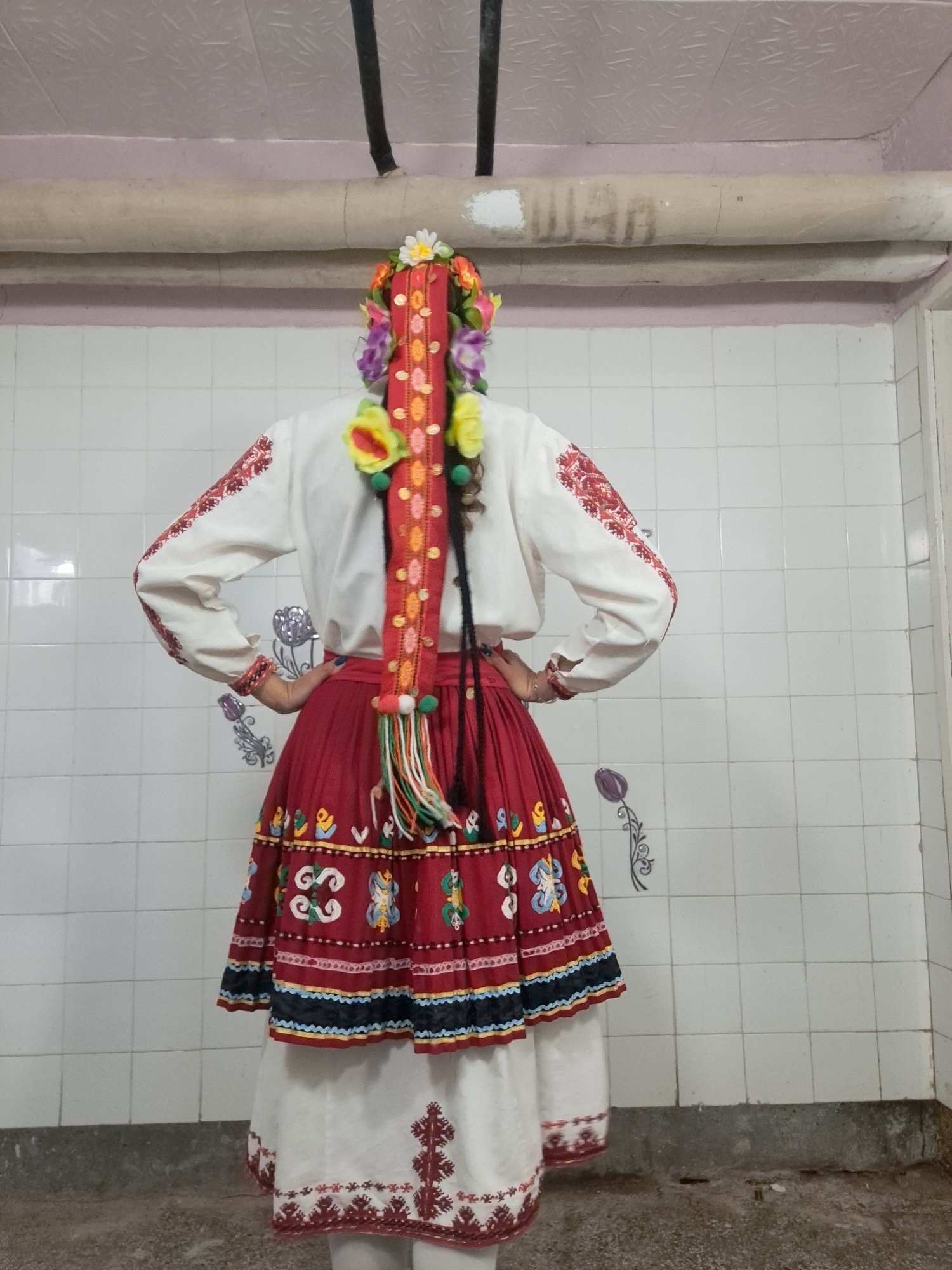 A person stands in a tiled room wearing traditional Bulgarian clothing. The person is oriented vertically in the image, with their head at the left and feet at the right. They wear a white shirt with…read more