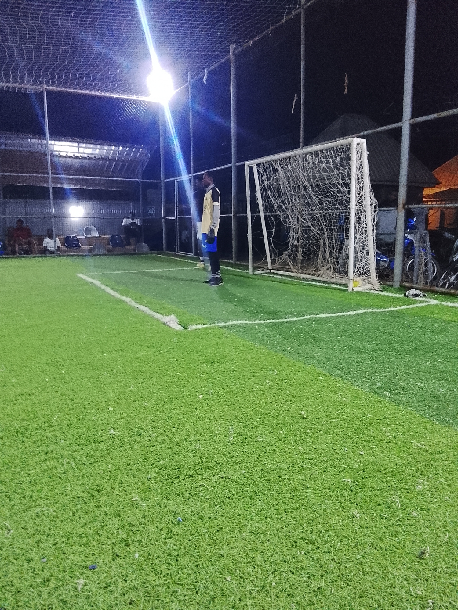 The image depicts an artificial turf soccer field at night, likely in Akwanga, Nigeria. A man in a light-colored jersey and blue shorts stands near a goal, facing away from the camera. The field is en…read more