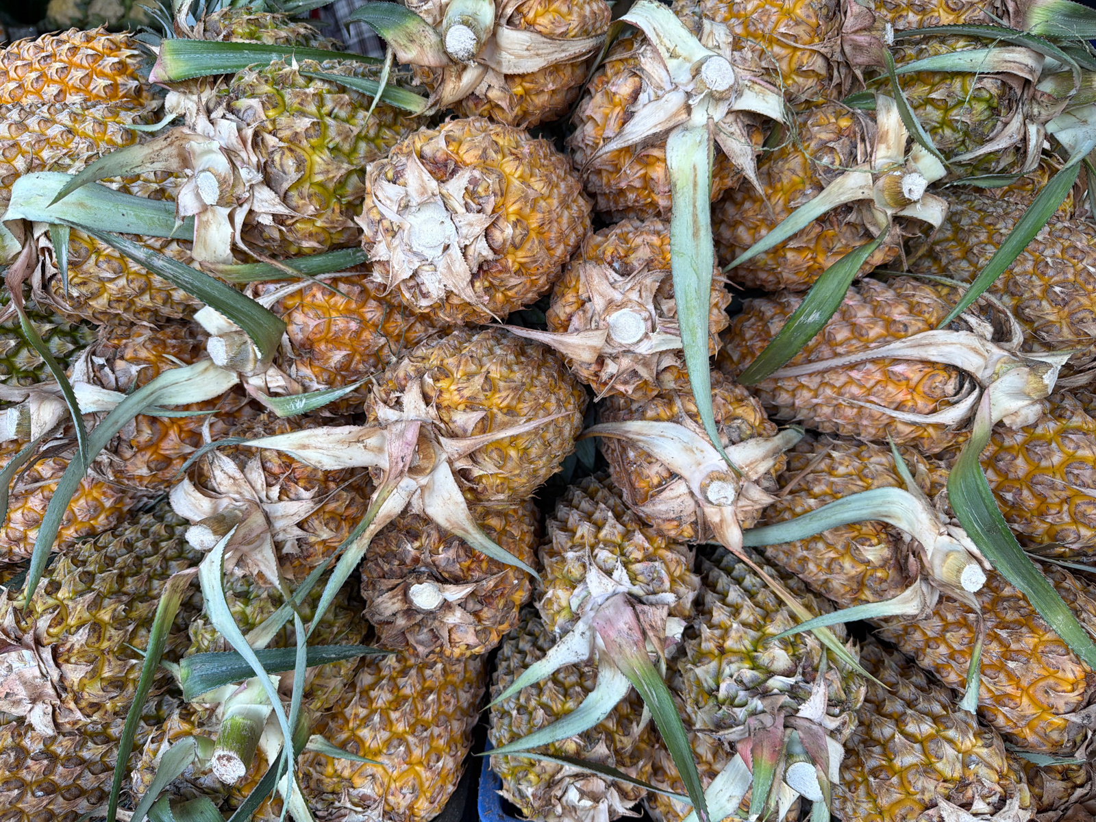 The image displays a close-up, overhead view of a large, dense pile of pineapples. The frame is entirely filled with these tropical fruits, with no clear background visible. The pineapples are mostly…read more