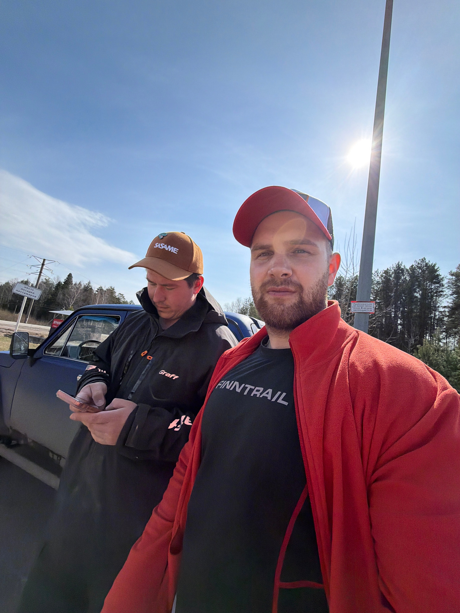 The image, set in Chaikovsky, Russia, shows two men outdoors on a very bright, sunny day with a clear blue sky. The sun is prominently visible in the upper left, creating a starburst effect. In the f…read more